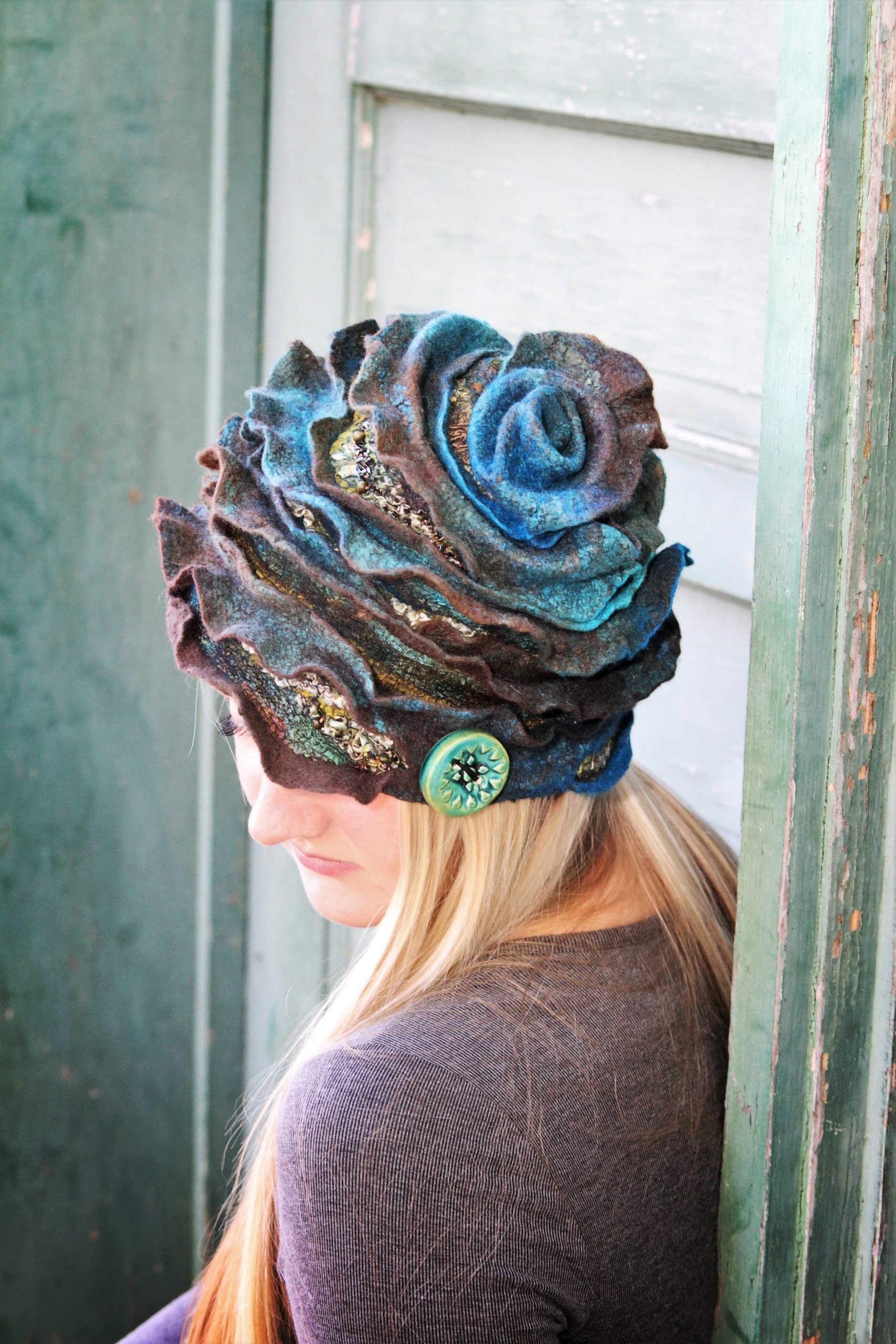 Wet-felted wearable art hat created using multiple resists and embellishing fibers and fabrics.