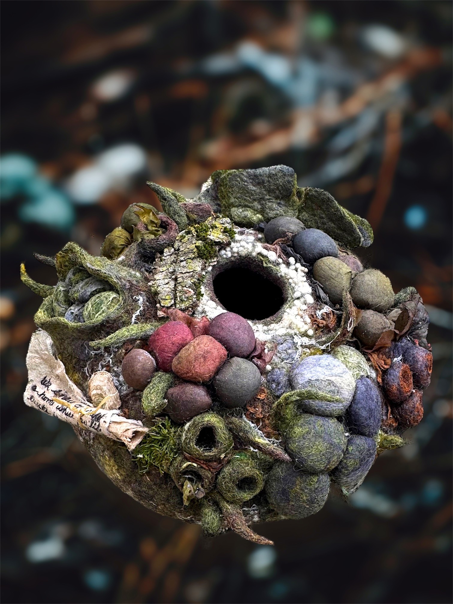 Wet Felted using Bergschaf Wool, Merino Wool, silk, wool nepps, embellishing fibers, bark, moss. 6"x10"x10"