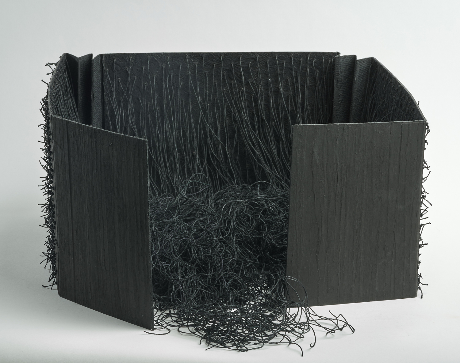 Bookbinders' board,, canvas, mulberry paper, used typewriter ribbon and hemp cord 9 x 22 x 7.5"