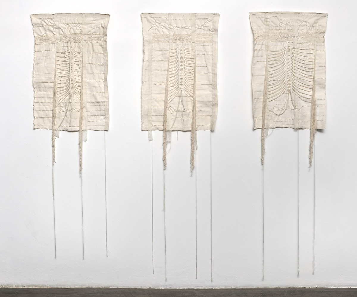 Canvas, acrylic paint, string, hemp cord, lace 64 x 68" (dimensions variable)