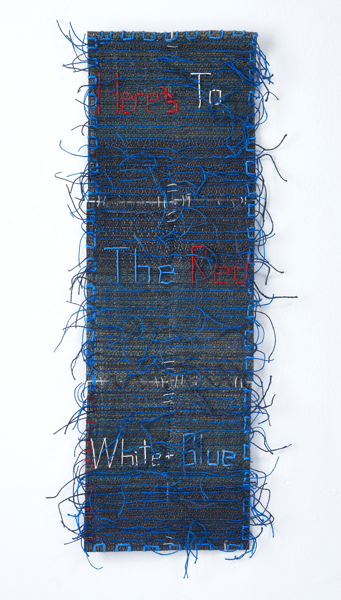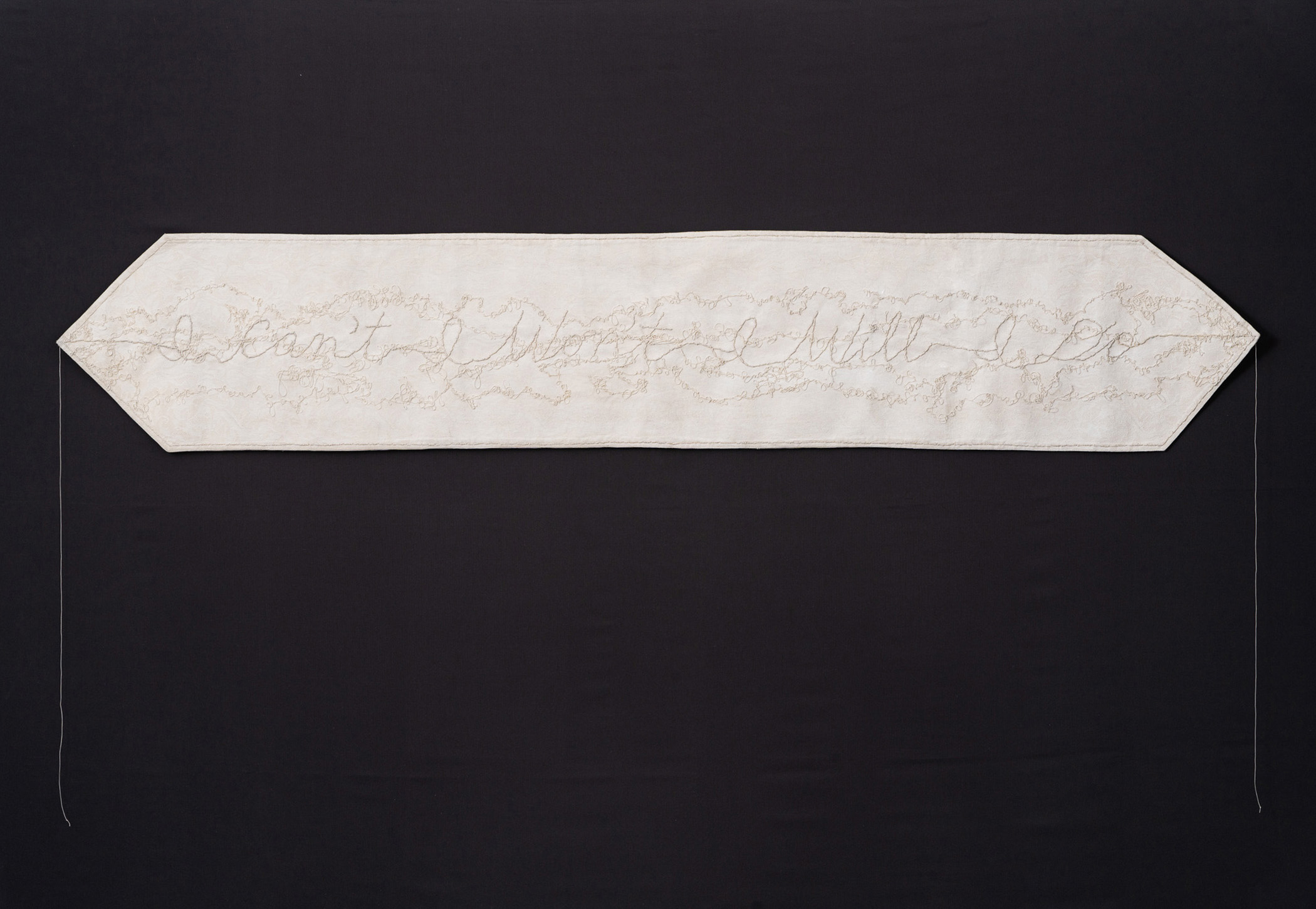 "I Can't I Won't I Will I Do" is a hanging work, a textural and textual tapestry that speaks to the effort, the will and the energy required to create, to bring ideas to life, to DO; and our initial resistance to this process. The stitched text and tangled threads run the length of the table runner.
