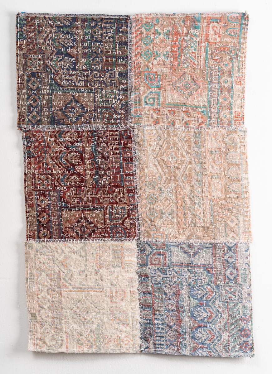 “Hopes and Fears and…” describes a state where the mind obsessively repeats what it fears, framed in the mantle of hope. Such a process is a way of dealing with darkness. Are not hope and fear intrinsically linked as two sides of the same coin? We fear, then we hope that the realization of our fears does not manifest. All the hopes and fears stitched into this work are born of the state of our world, planet, society, and culture, and are voiced by many across the globe. This piece gives voice to those voices as well as my own.