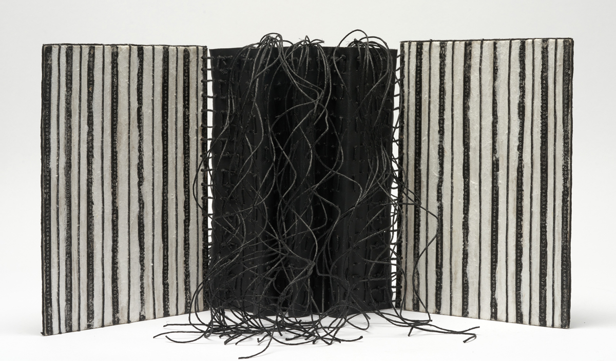 "It's Not Black and White" draws from the form of the codex book, with strings standing in for pages, and speaks to the increasingly dangerous black and white rhetoric sweeping our planet. Its "bars", alternating stripes of repurposed typewriter tape no longer extant in our world as a modus of communication, and mulberry paper, a "natural" material sourced from a tree, speak to the concurrently increasing level of incarceration of human beings, ideas and freedom. It can be displayed standing up, in any degree of opened or closed on a surface parallel to the floor. When opened, it can span up to 22 inches wide.