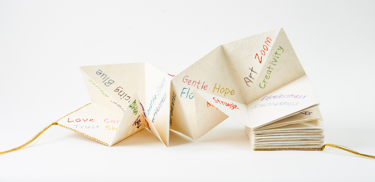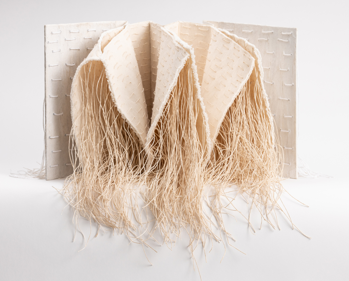 Bookbinders' board, watercolor paper, mulberry paper, hemp cord, acrylic paint, ribbon, lace 10.5 x 25 x 18”