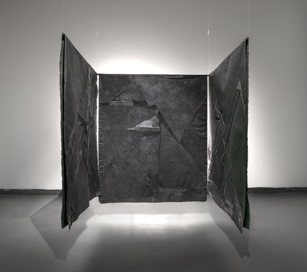 “KnoW Safe Place” is an installation composed of 3 two-dimensional components that create a three-dimensional architectural space which can be entered and thus experienced from both within and without. In a time of fraught change, conflict and uncertainty, the work speaks to the challenge of finding any safe place to be, while simultaneously providing this to the viewer-participant. Creating such a place out of textiles, paint and wood expresses the power and dignity of our own making processes and imagination.