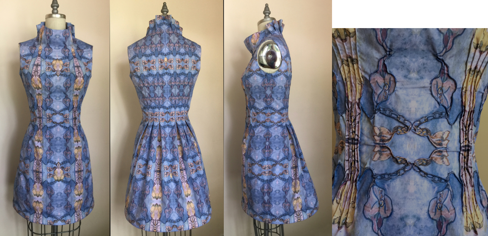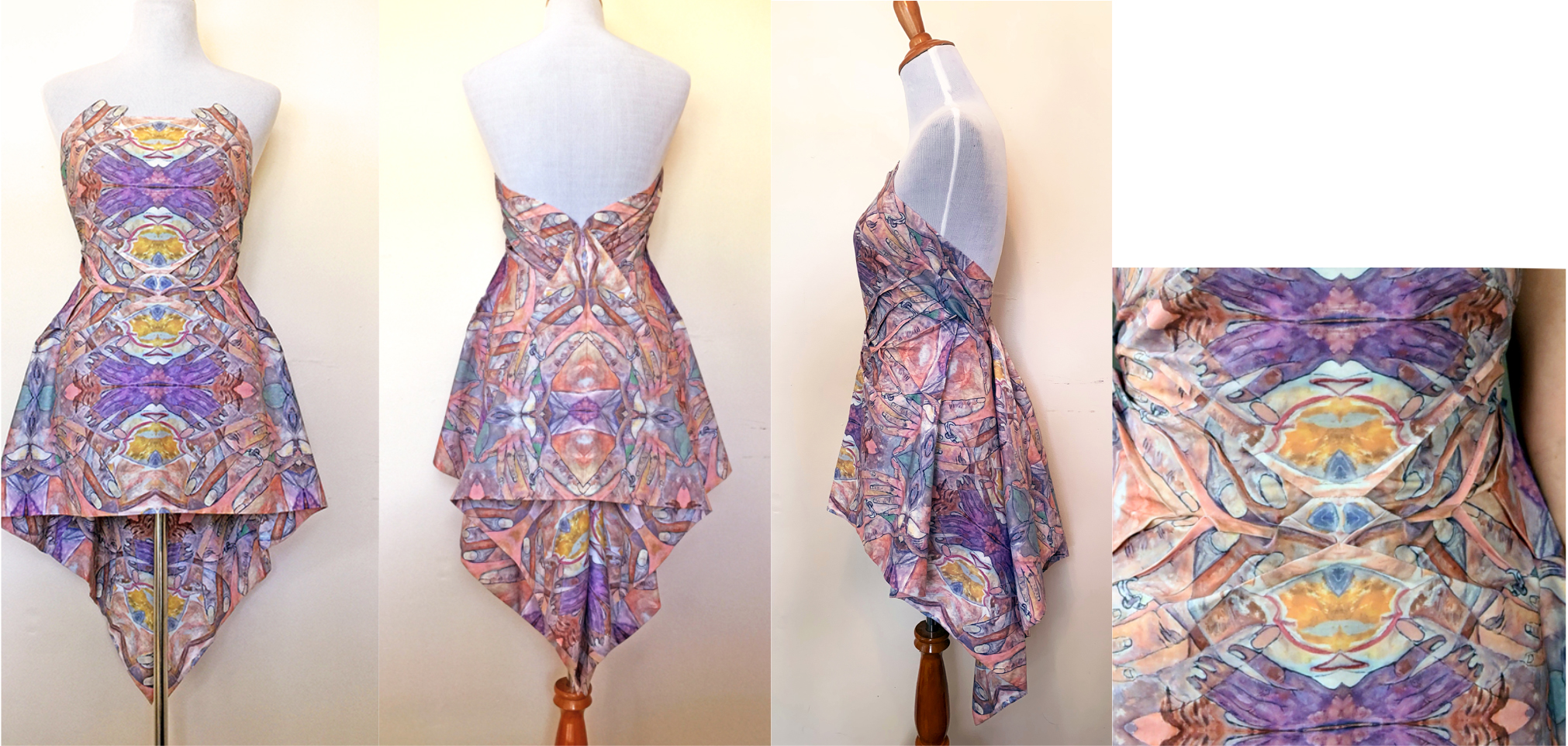 Larry Rushing’s fine art paintings inspire my textile designs. The integration of my two-dimensional designs into three-dimensional garments is my design challenge – to create an original 2-D design and form it into a unique and innovative 3-D form. Derived from parts of a painting that took three months to complete, this print was developed through dozens of Photoshop iterations. The painting was chosen because I was curious about how the series of hands that appear in it could wrap around the body in the shape of a dress. The title of the dress reflects the hands from the original painting around the chalice-shaped figure that resulted from the repeat technique of mirroring - used to evoke the painter’s surrealistic style. The irregular but symmetric tucks near the midriff are intended to manipulate the print and form while adding surface texture.