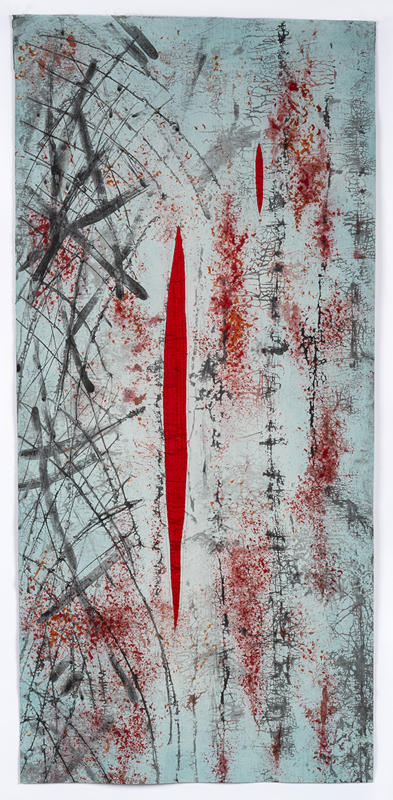 Tear, a homograph, depicts my anguish for the rending of my illusion of our social fabric. The original flour paste resistpiece illustrated the fracturing of the surface. Slashing the piece allowed me to reverse applique the brilliant scarlet dupioni, the wounds are now exposed.