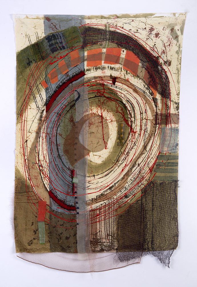 Entangled began as one of several mono prints using ovoid or enclosed forms. As the piece evolved, I over-printed and added collaged pieces of hand printed silk organza, delicately stitched and embroidered. I had been looking at Louise Bourgeois and the inclusion of the remnants from some serged edges added the menace I was feeling from this work.