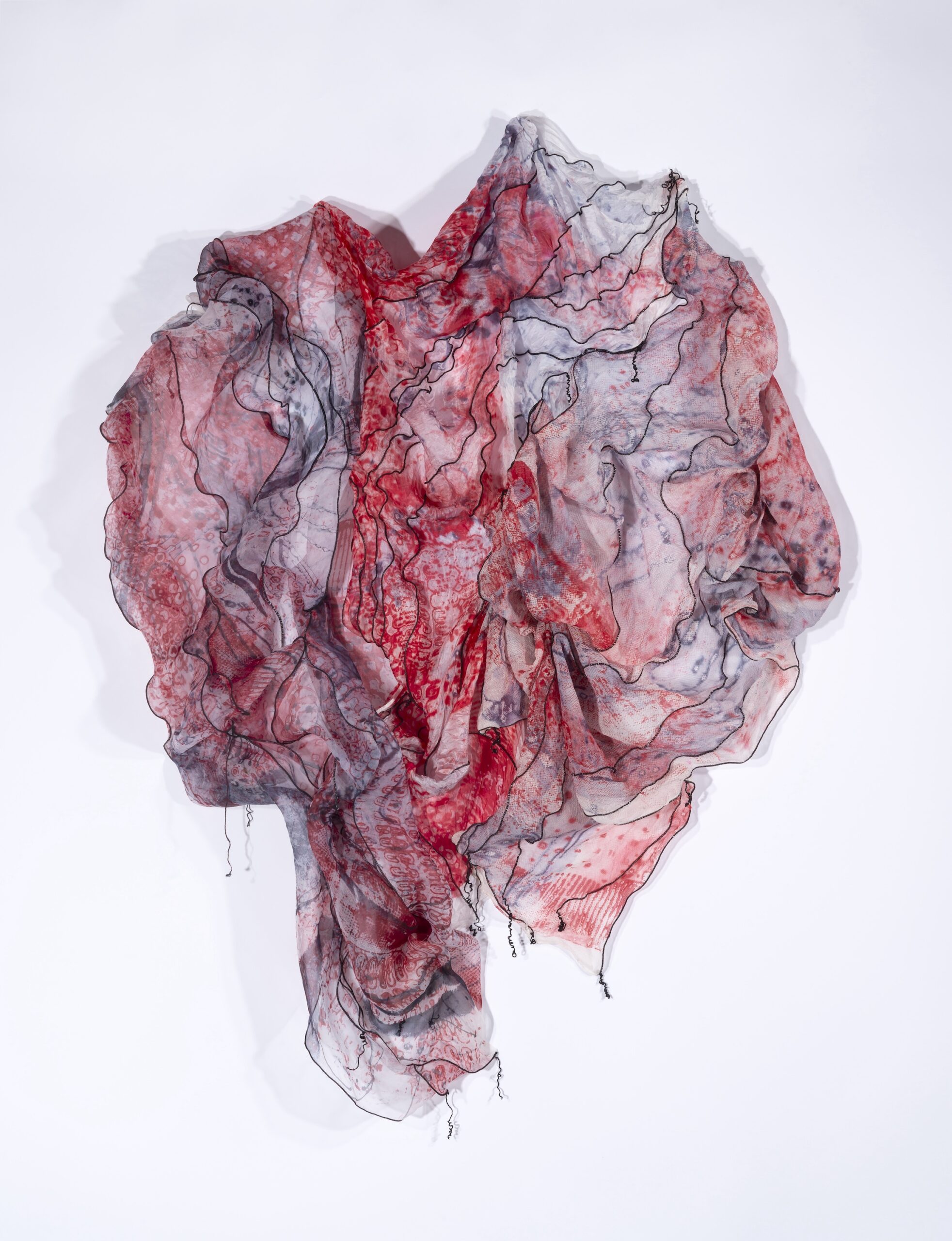Transit continues my exploration of painting two or more layers of different weight silk at once. Using both direct dye drawing and breakdown printing I build a highly textured visual surface. I added small strips of previously printed silk and tied the two layers with small areas of stitching. My goal is to keep the viewer engaged as they Transit throughout the piece, step away, move in close.