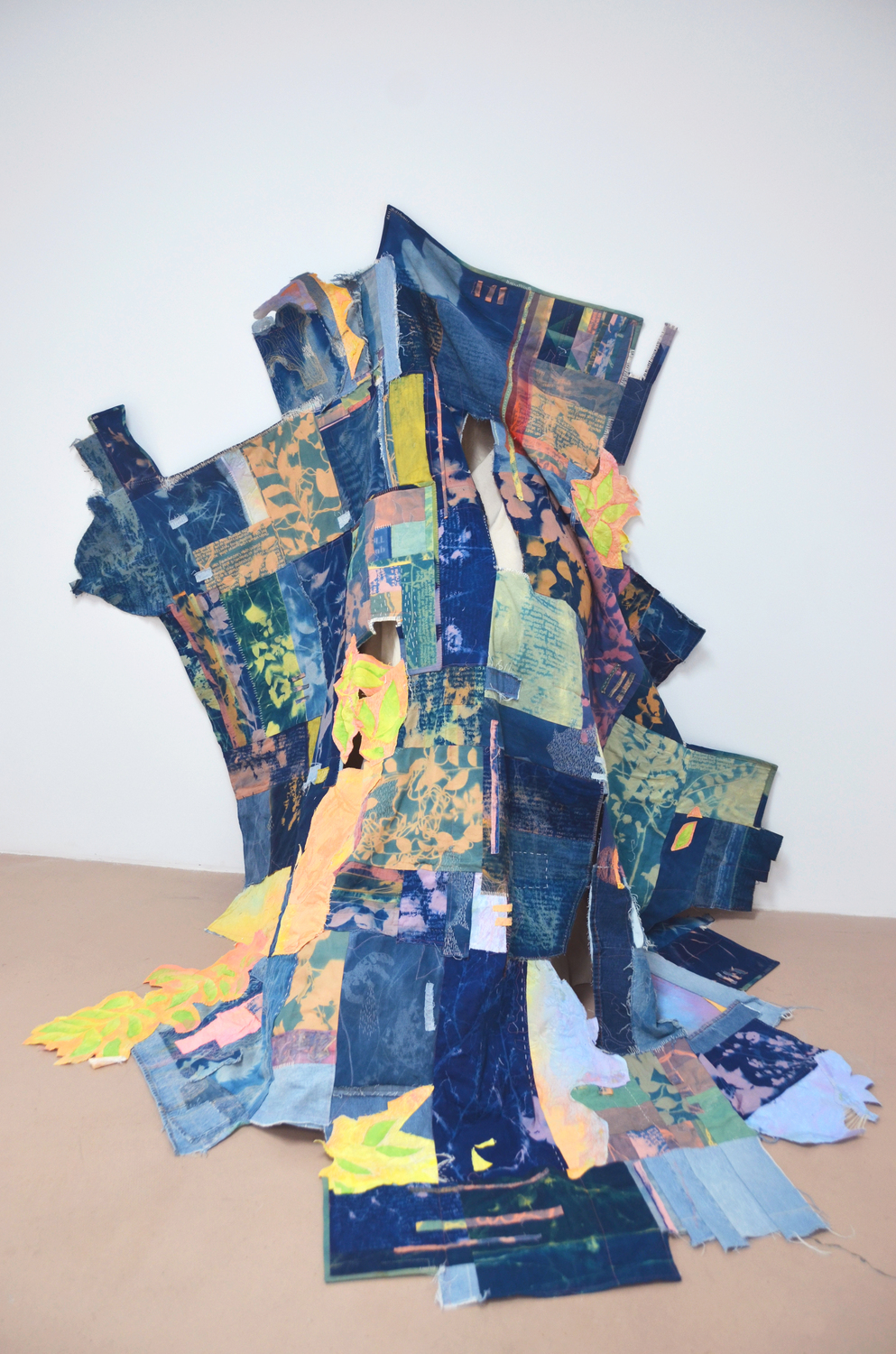Cyanotype on cotton fabric and denim, acrylic paint, canvas, thread, tule, batting 90”x86”