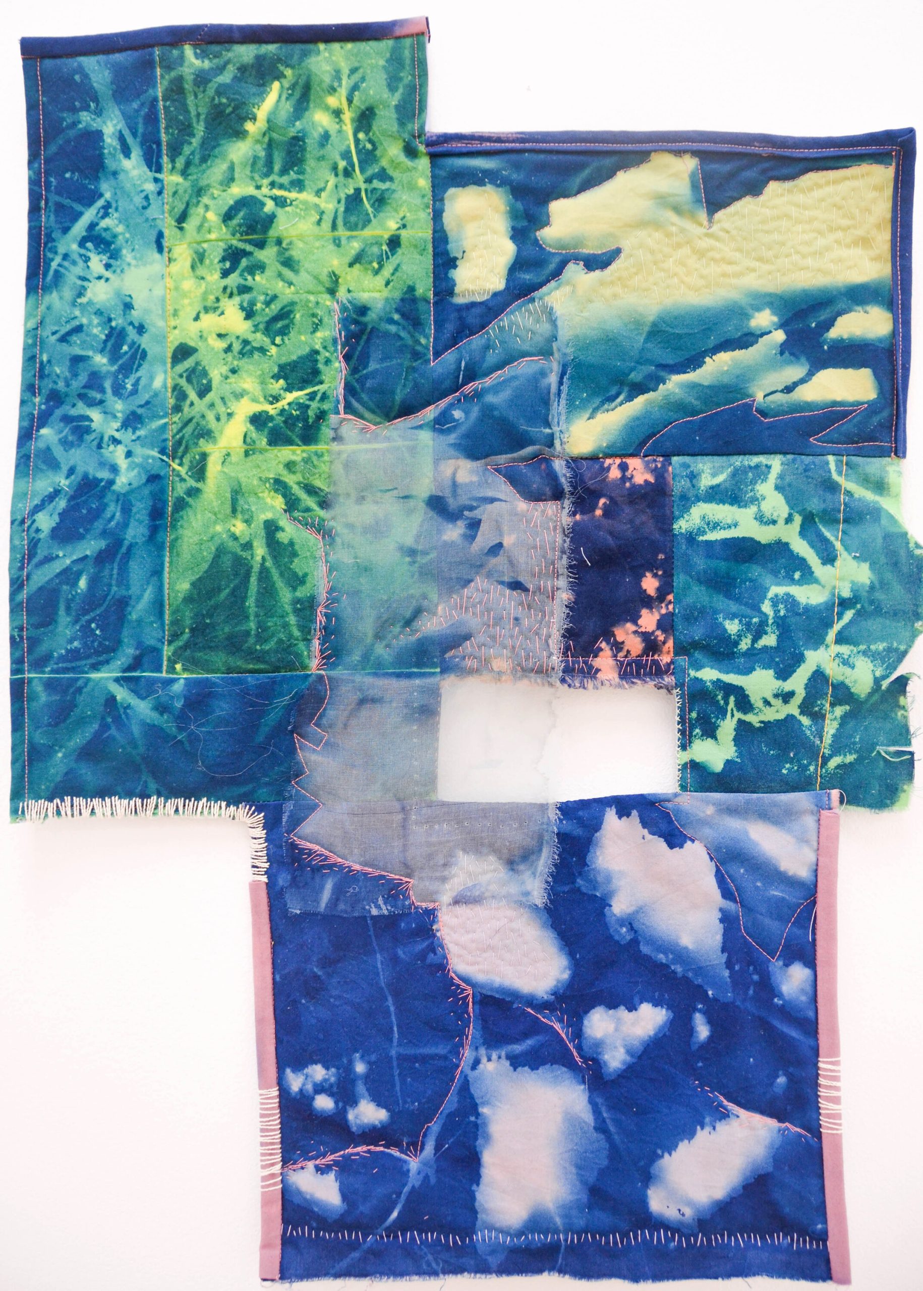 Cyanotype on colored cotton fabric, thread, batting 18”x25.5”