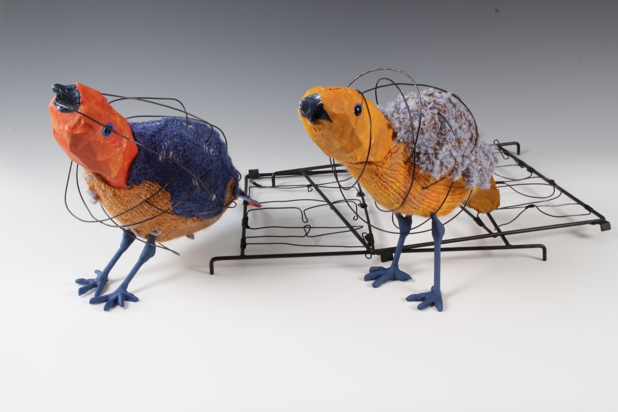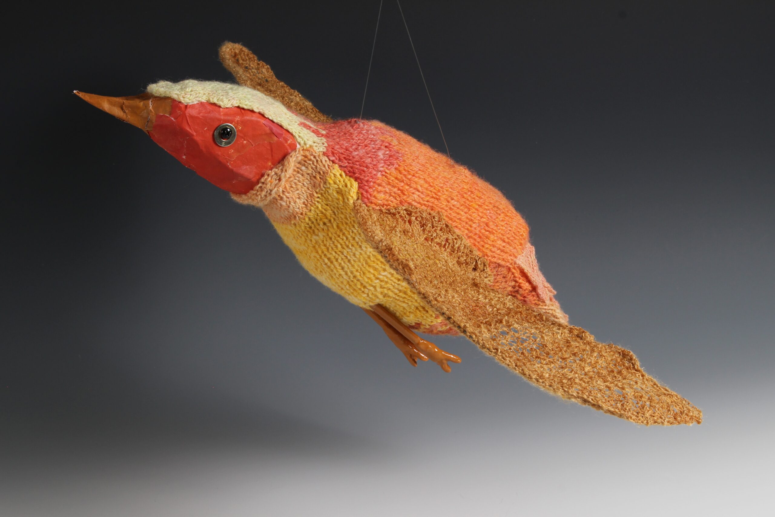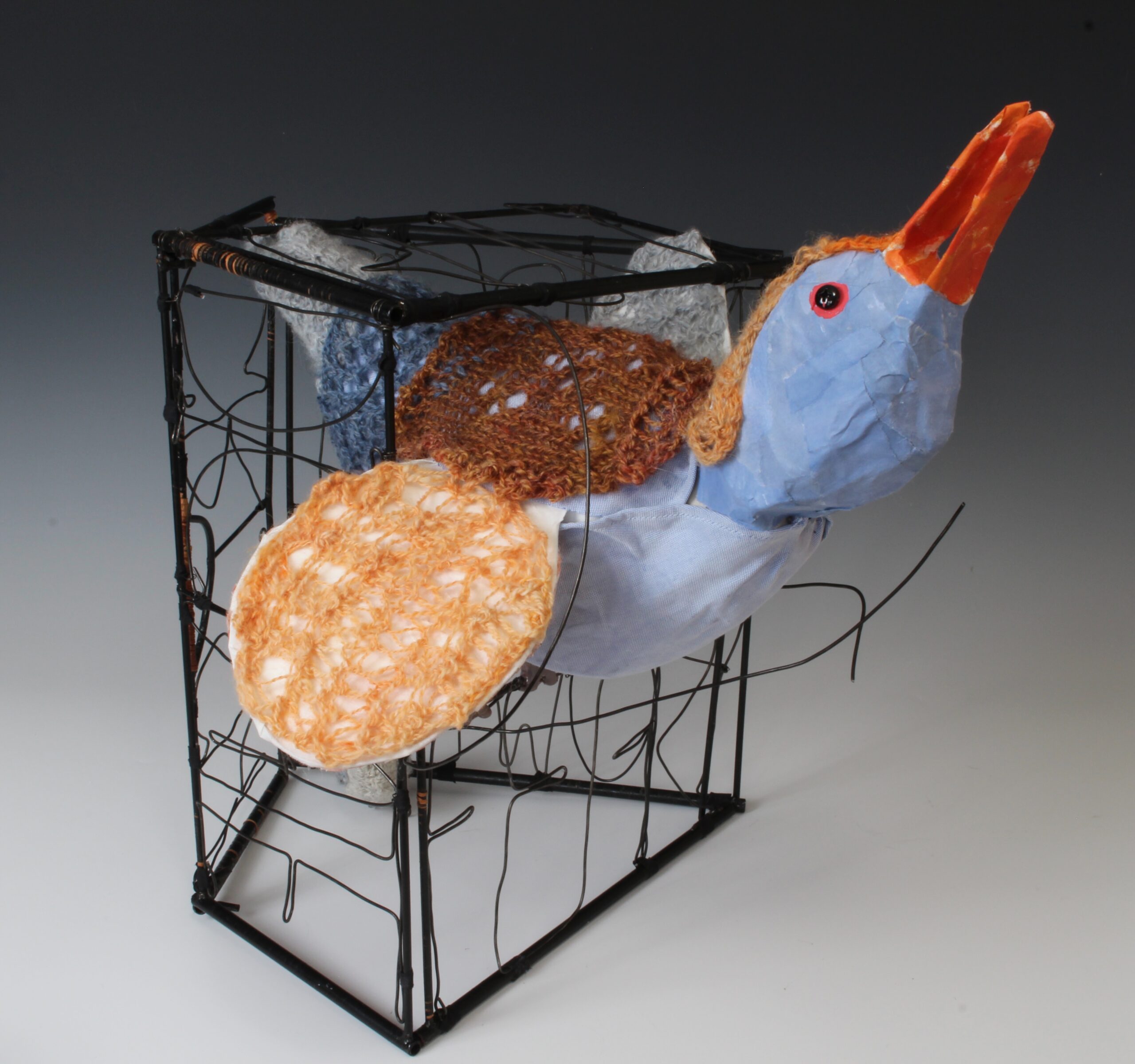wire, metal frame, handspun yarns, rigid foam, cloth tape, mulberry paper, wood, clay, acrylic paint, screws 10 x 20 x 23 in