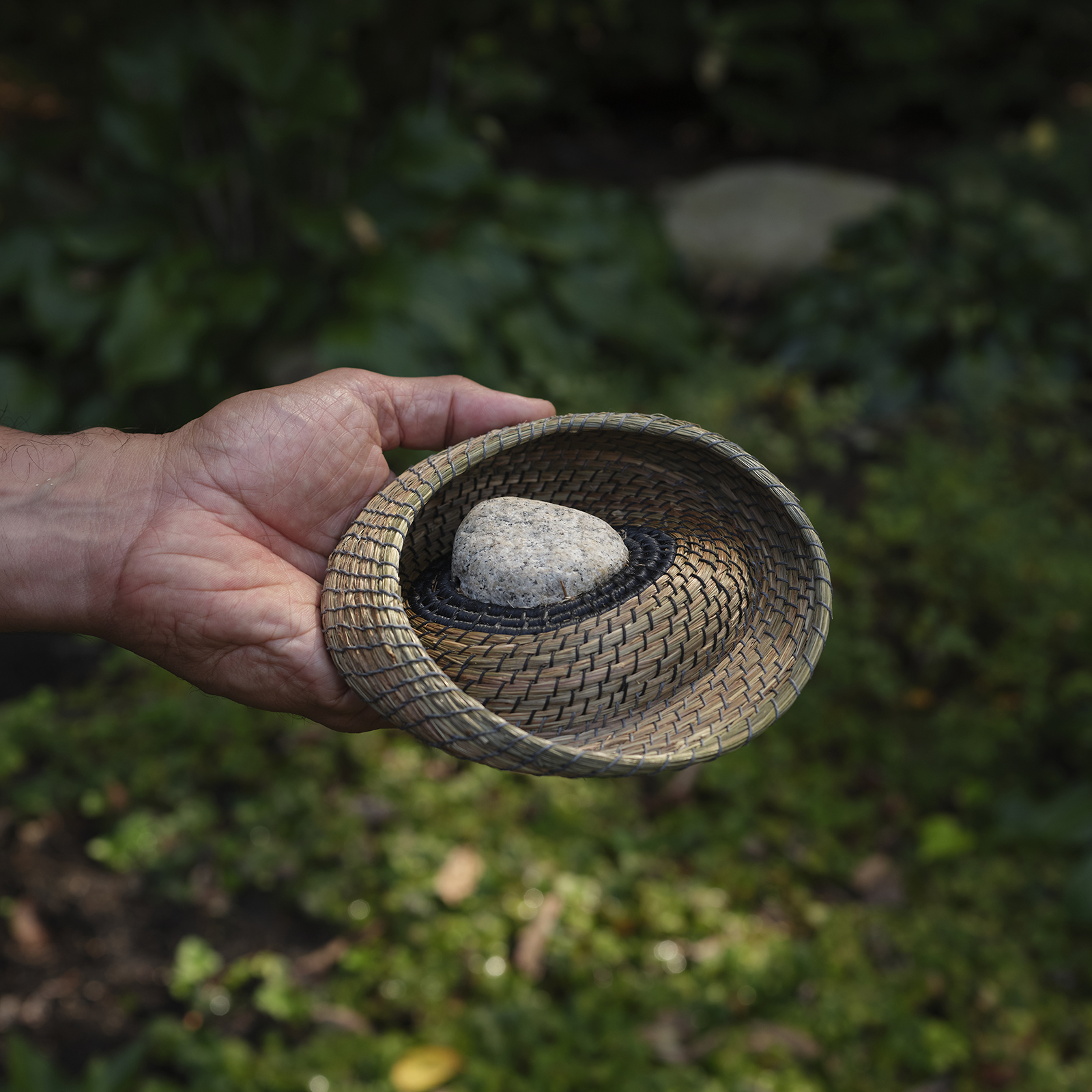 sweet grass, found stone, waxed linen thread (coiling, drilling, stitching) 3 x 4 x 6.5 in