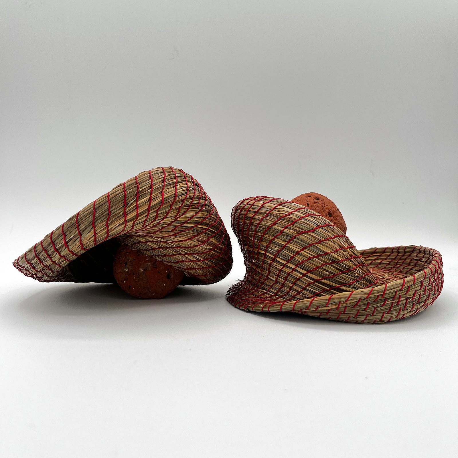 sweet grass, swamp oak, waxed linen thread, artificial sinew (coiling, drilling, stitching) 2 x 8.5 x 14.5 in