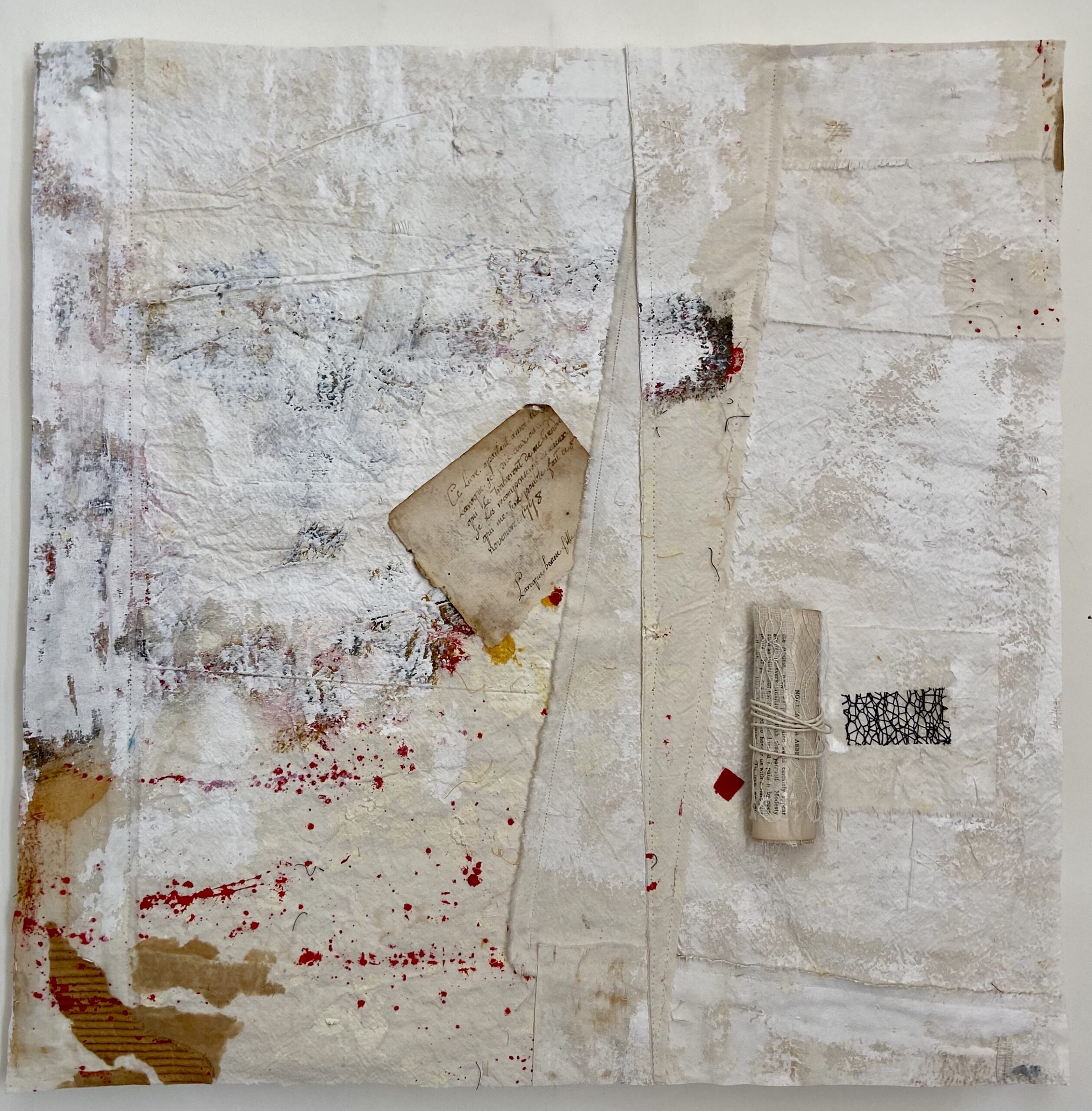 Antique book pages, netting, card, antique linen, paint 50 x 50 cms