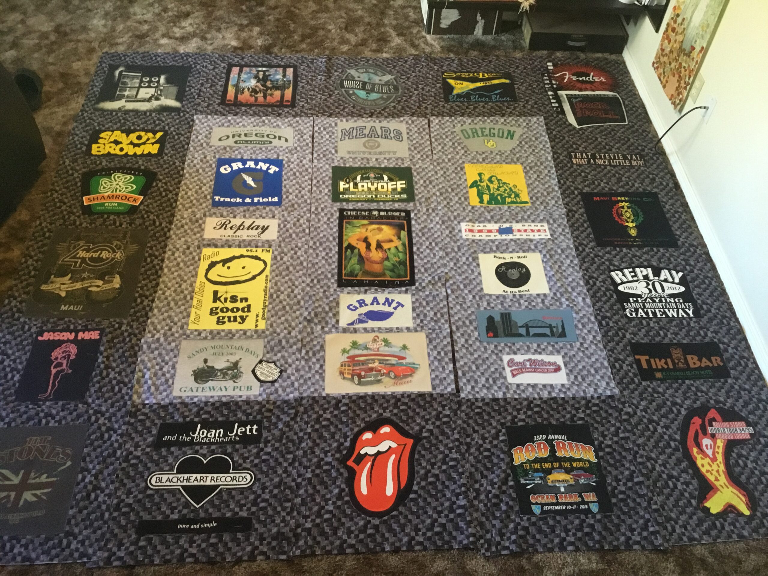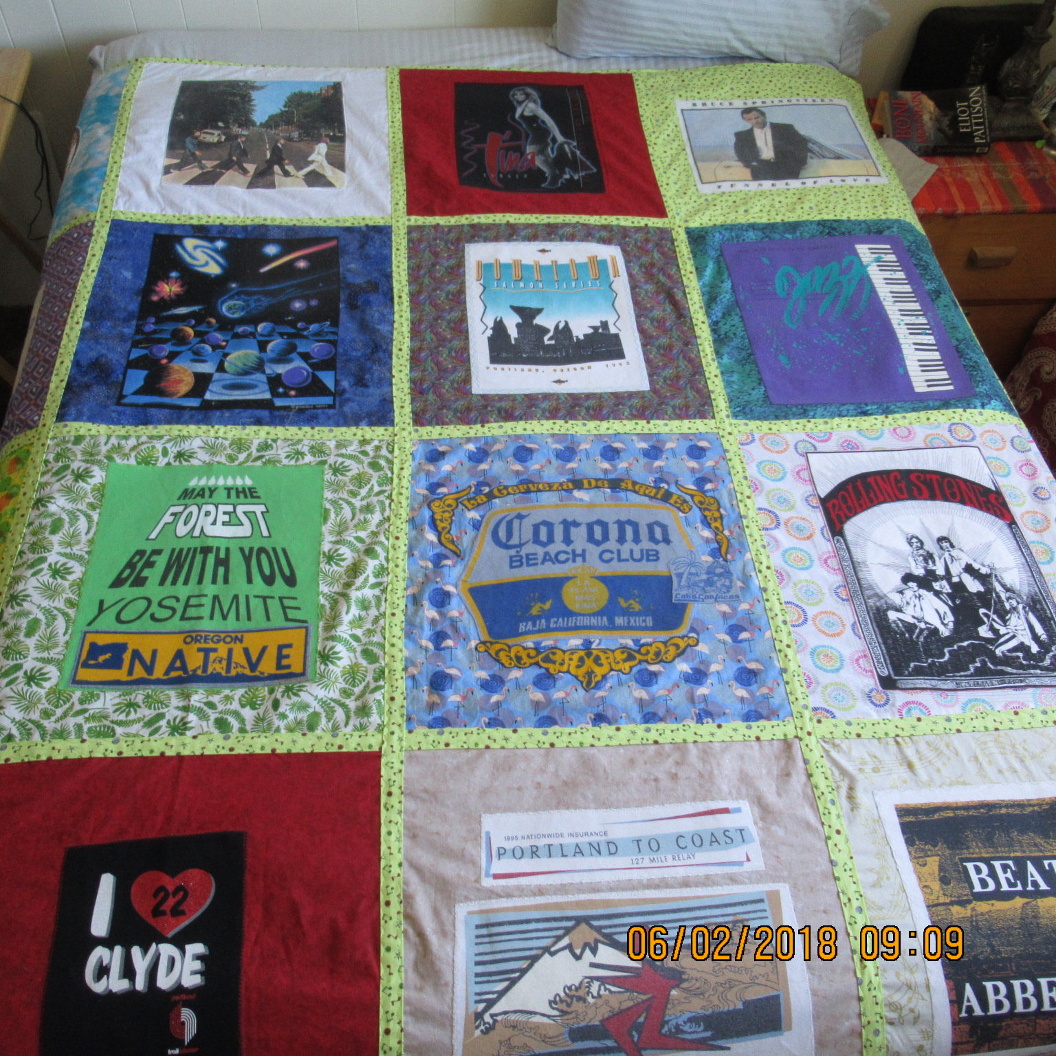 A collection of personal tee shirts by a male client made into a flannel backed cotton quilt.