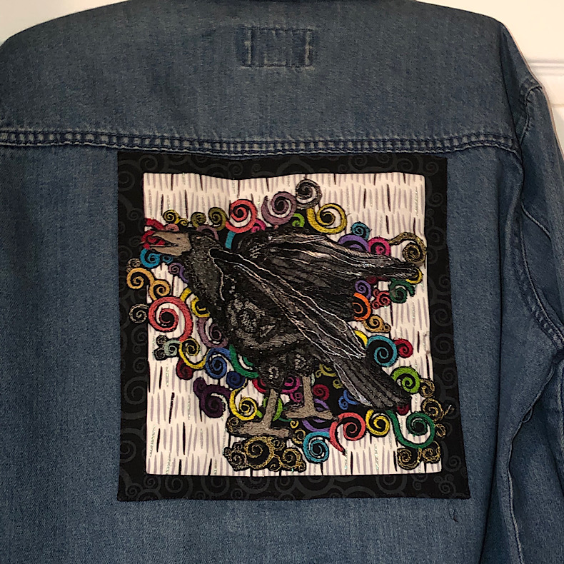 Crows love to play in the rain! Embroidered swirls and iridescent rain make it special.