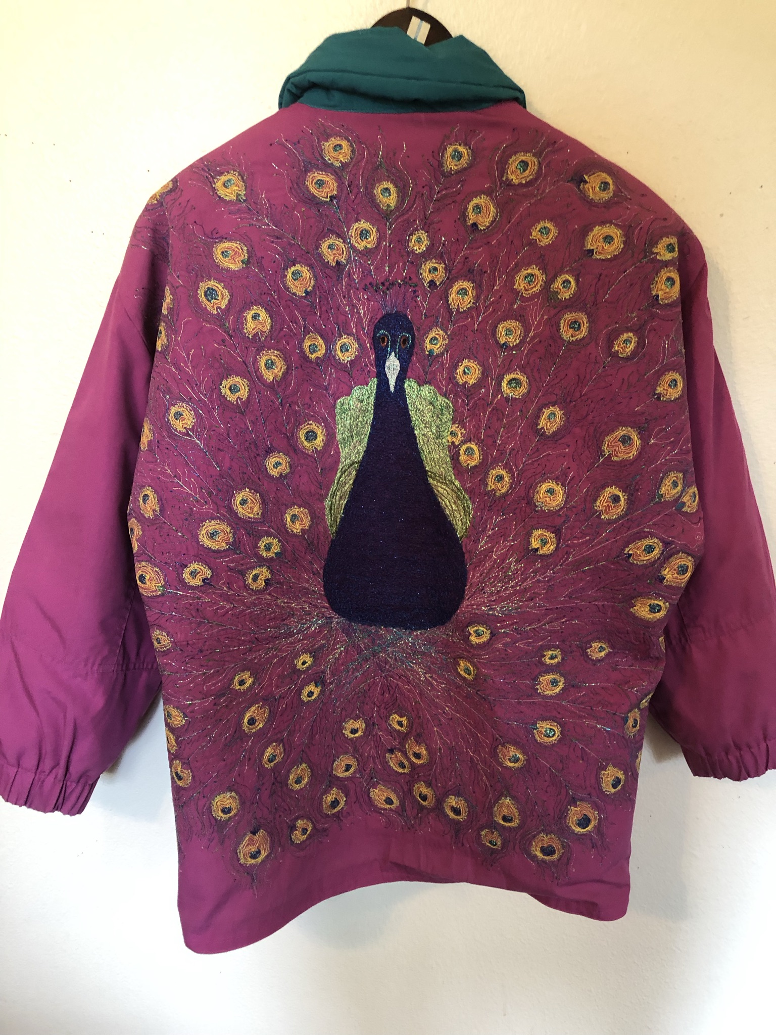 Acrylic, quilted ski jacket, machine embroidered images on back and front, cottons, gold and iridescent threads Mens Size Large
