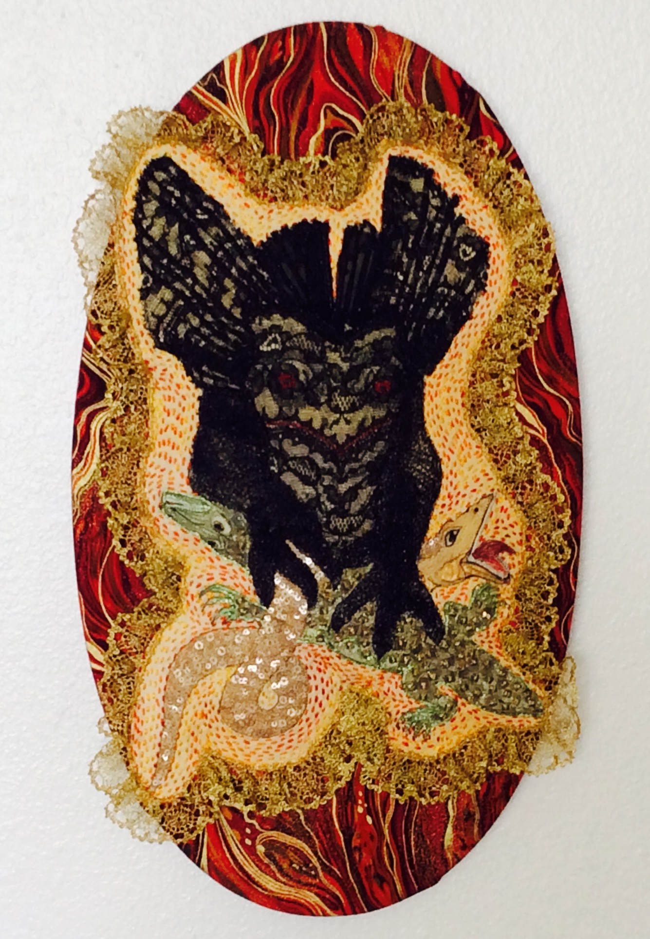 woven ribbon, collage lace, silver embroidery, crow beads, silver milagros 14”X14”