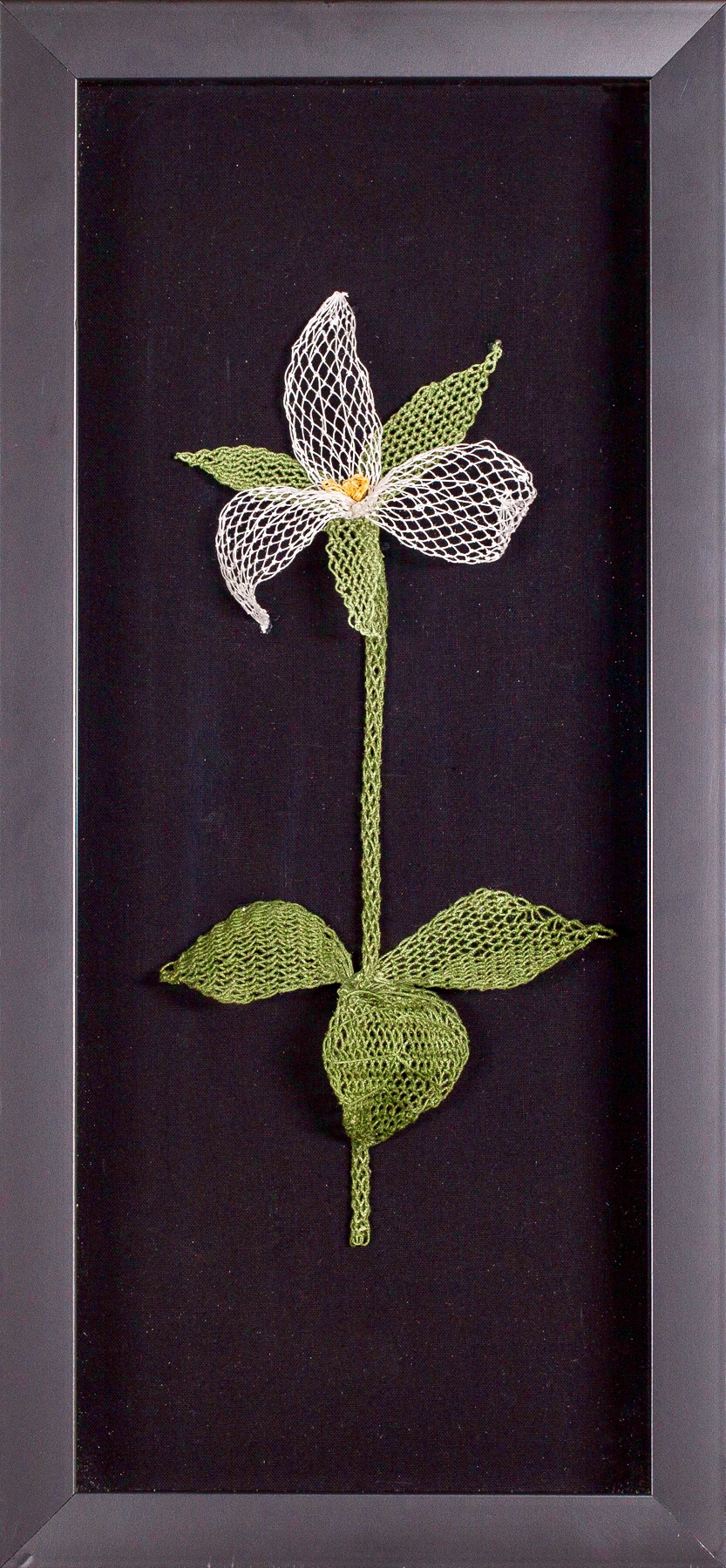 Traditional knotted netting is the technique used to make this 3-D net. Each piece is net over a toothpick with an antique needle. Then stiffened & shaped, mounted on black fabric & displayed in shadowbox frame.