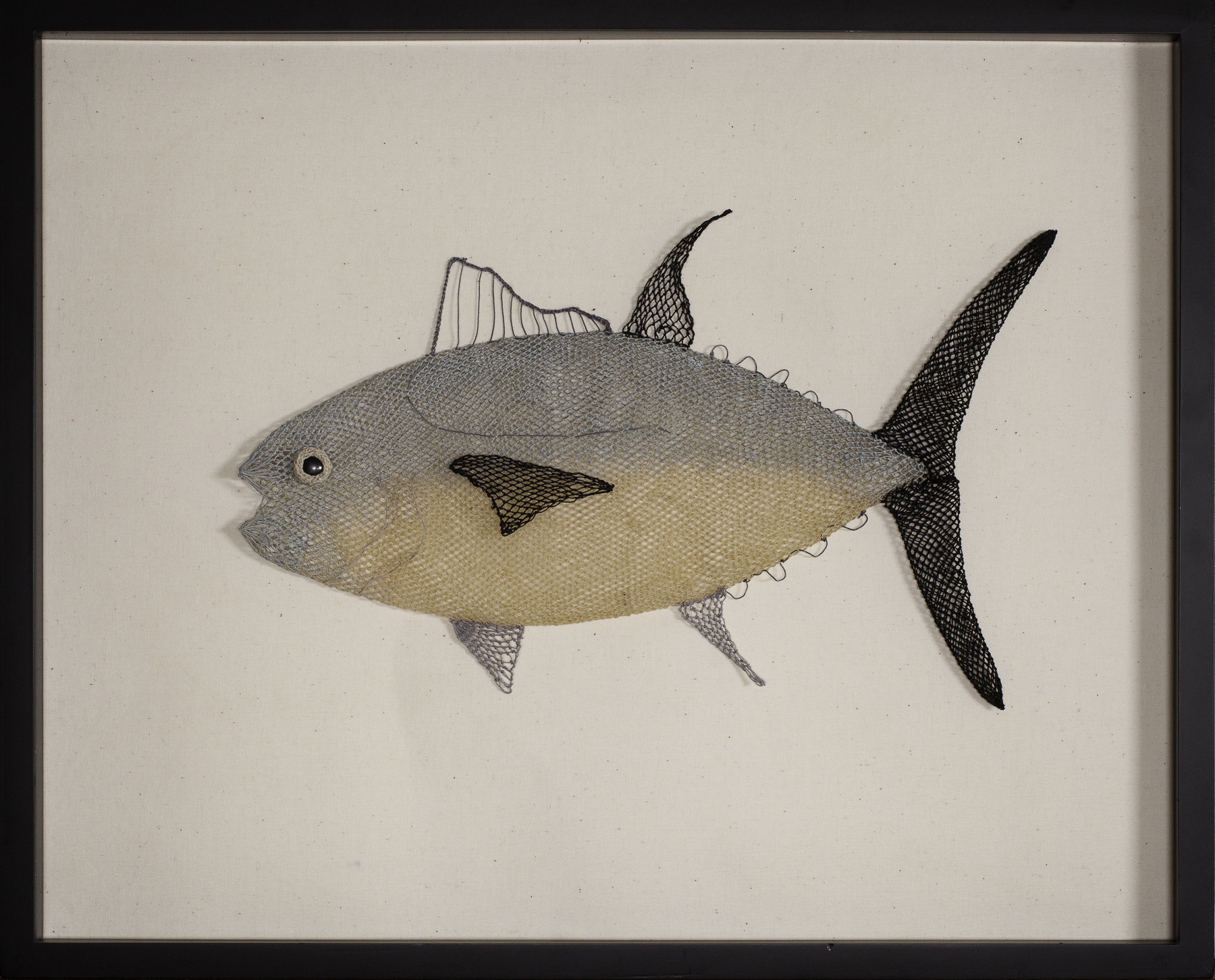 Done in traditional knotted technique with an antique fishing needle over a toothpick to achieve very fine netting. It is handpainted on the body, shaped & stiffened into 3-D form. Mounted on cotton fabric in shadowbox frame.
