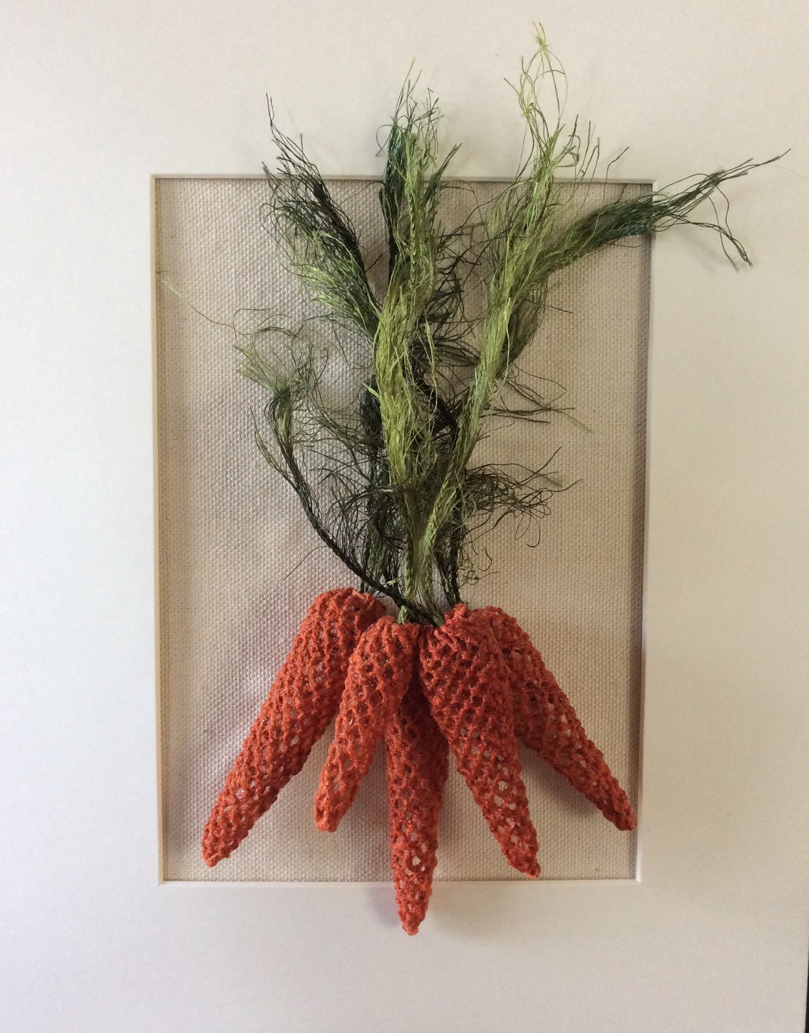 Hand netted in traditional knotted netting technique, linen carrots, shaped & stiffened into 3-D shape. Green acrylic tops mounted on cotton canvas