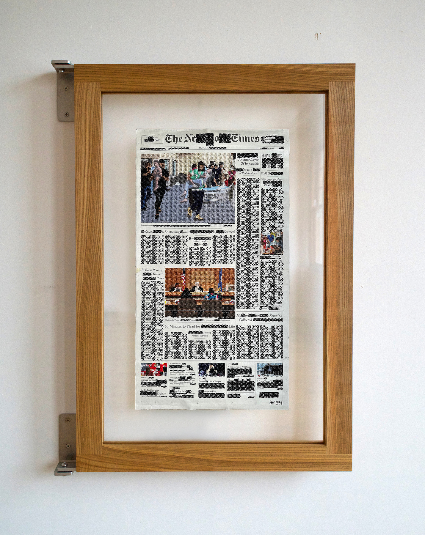 In an ever more polarized and digitized news stream, I created a visual binary code to bring attention to opposing poles. In lieu of ones and zeros (on and off, yes and no) I use black and white thread. I obscure reported facts by covering them with stitched coded messages. The slow and meditative act of stitching, placing deliberate marks through a delicate surface, takes attention and presence, a counterpoint to the fast-paced, constant flow of information in the impersonal and virtual context of the internet. These pieces are presented in custom made, double sided frames that hinge on the wall. Viewers may "turn the page" to view the verso.