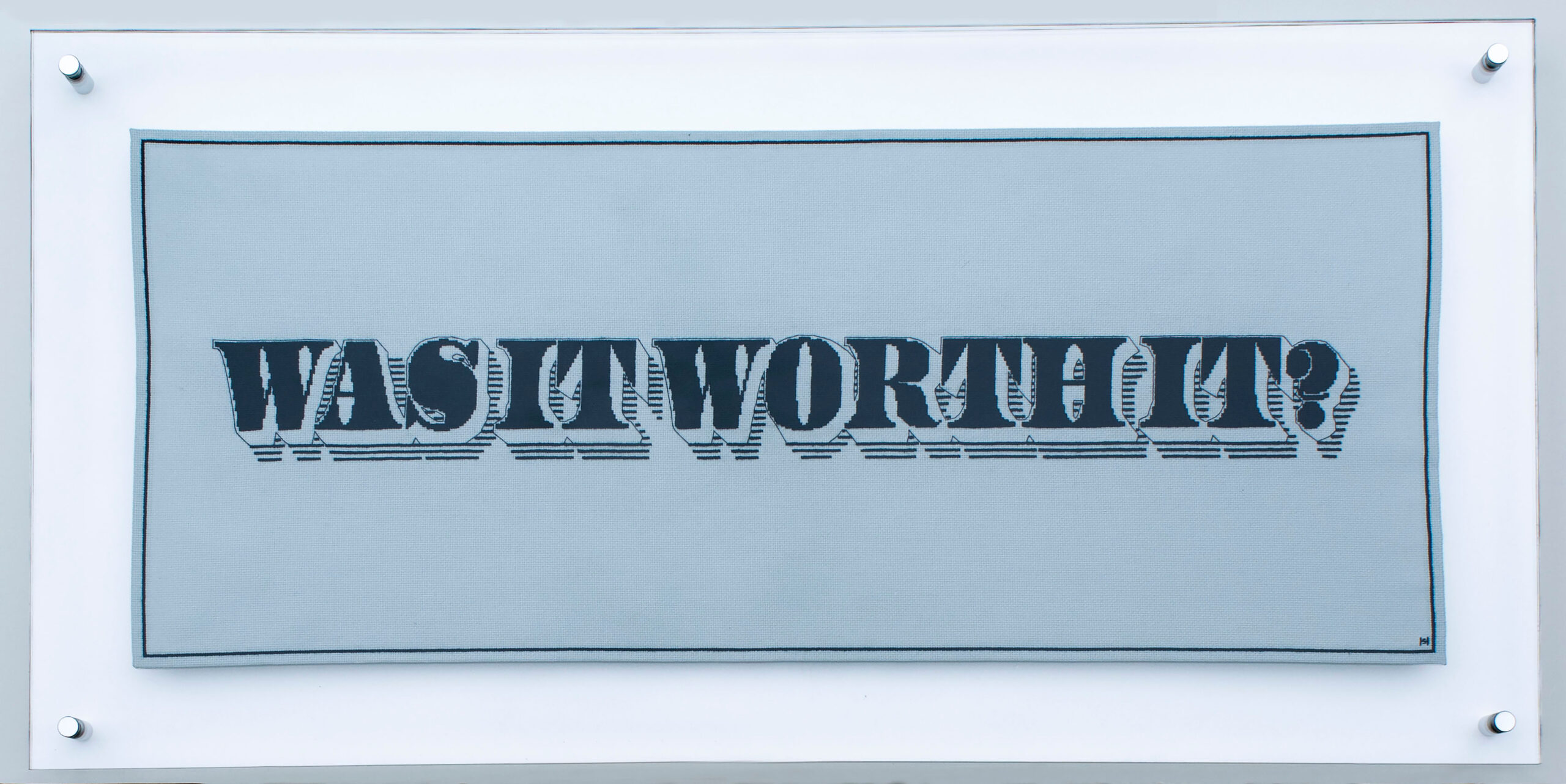 Counted cross stitch, grey cloth that was named "confederate grey" by the seller. I made this piece to contemplate our country's history of exploitation of people as a means to become "free" of oppressors and be financially and materially independent (at least purportedly). This piece's dimensions are based on our currency's proportions, and presented as collectible paper currency would be. The font is based on that on US currency.