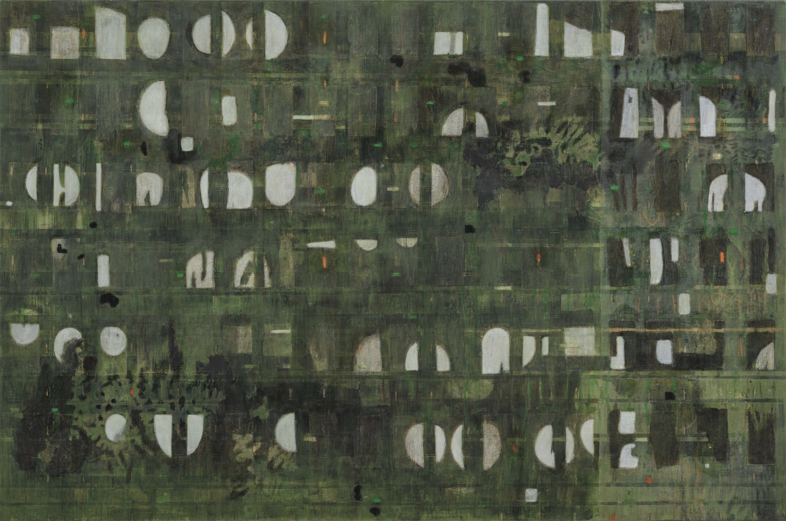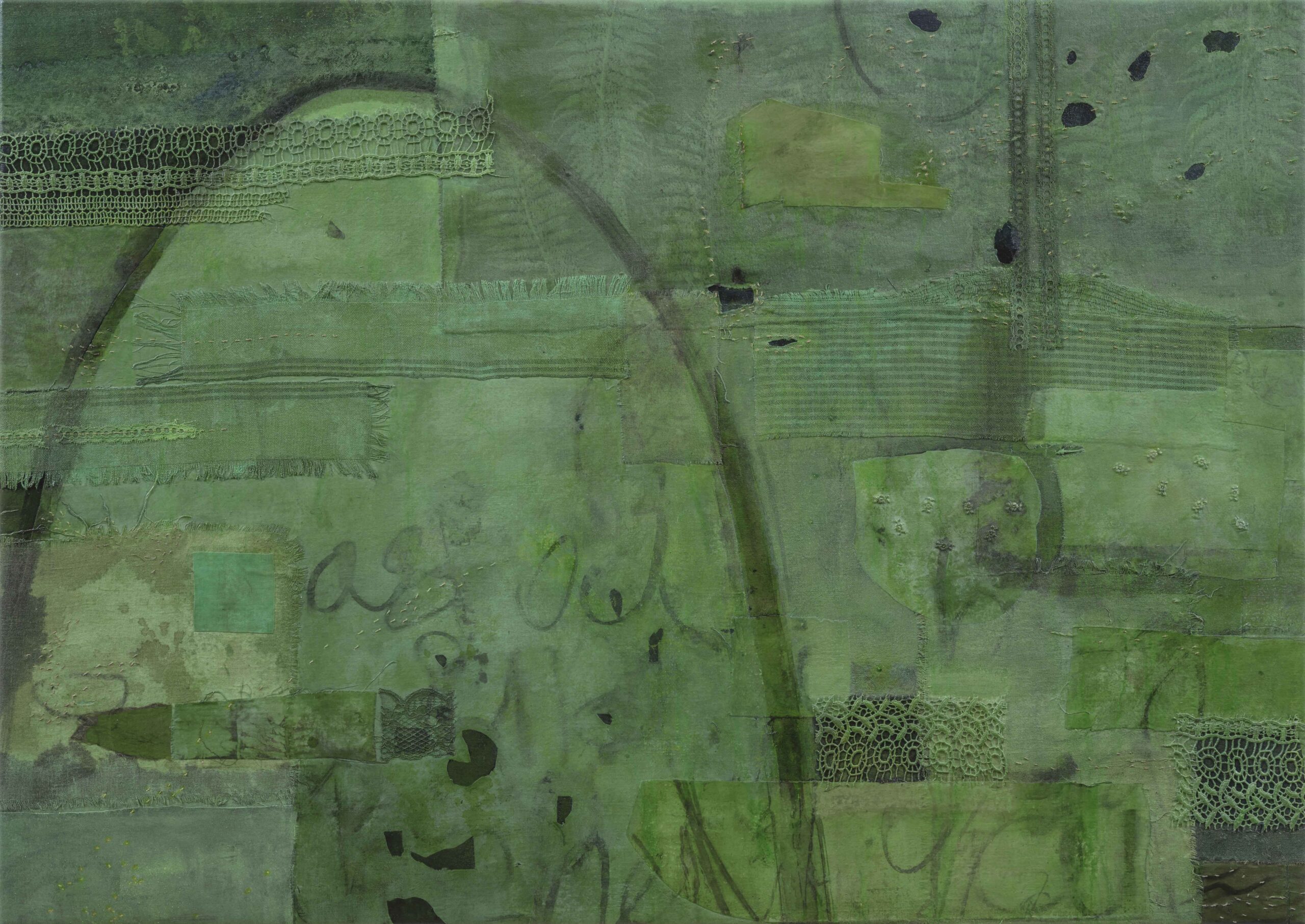 Acrylic, mineral paint, fabric, stitch on canvas 850 mm x 1200 mm