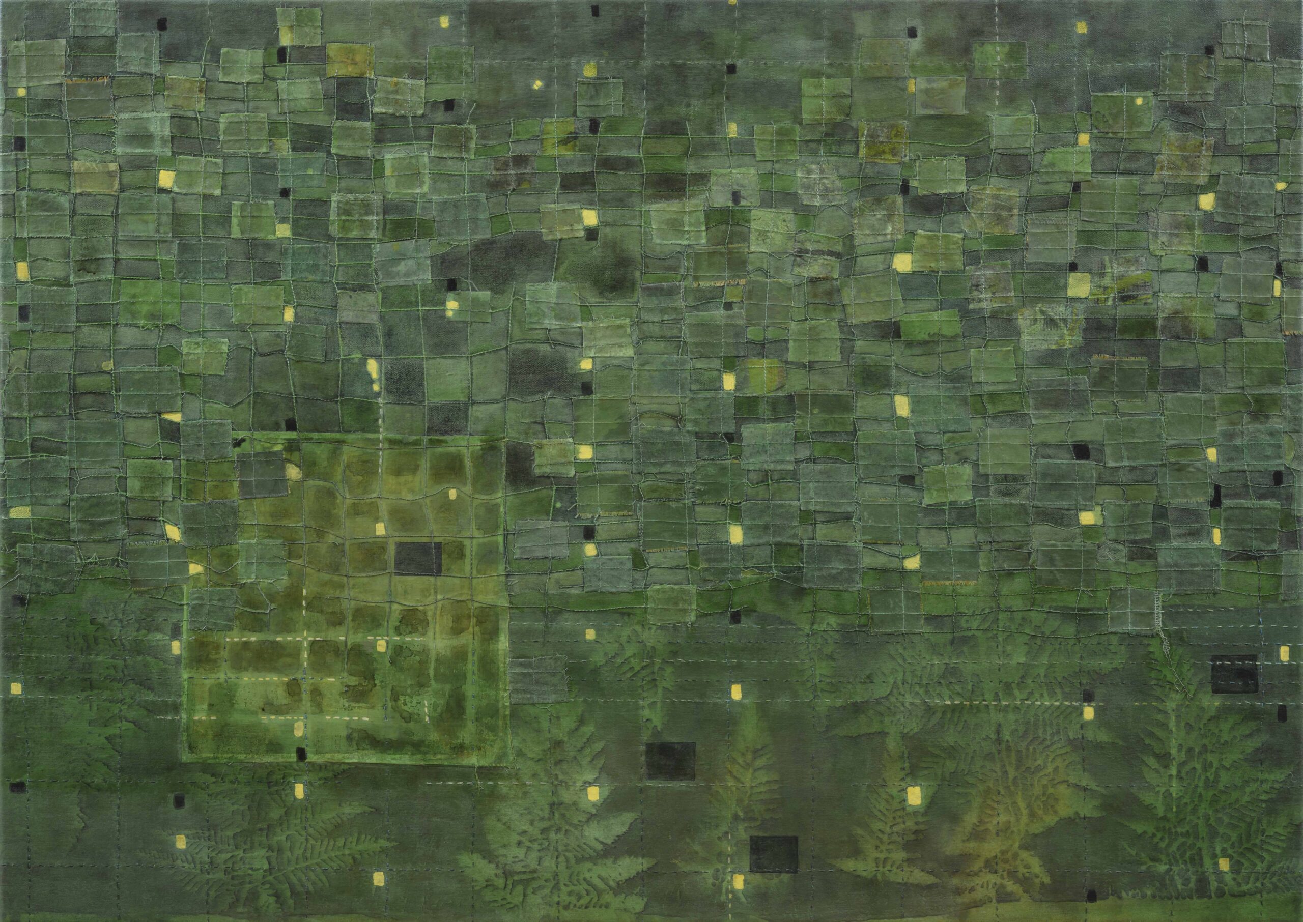 'Geogrid' is a mixed media collage, incorporating eco-printed and dyed fabric. Addition and removal of material relates to colonial surveying of the landscape.