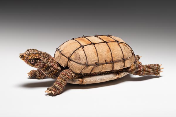 Wool yarn, wool stuffing, recycled house insulation foam, canvas, wire, tacks, polymer clay 5" x 6" x 12"