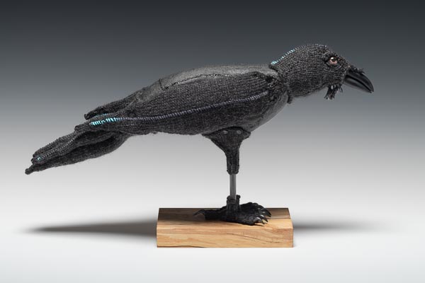 Wool yarn, wood, wool stuffing, polymer clay, recycled bicycle tire tubing, recycled house insulation foam 10.5" x 6.5" x 18"