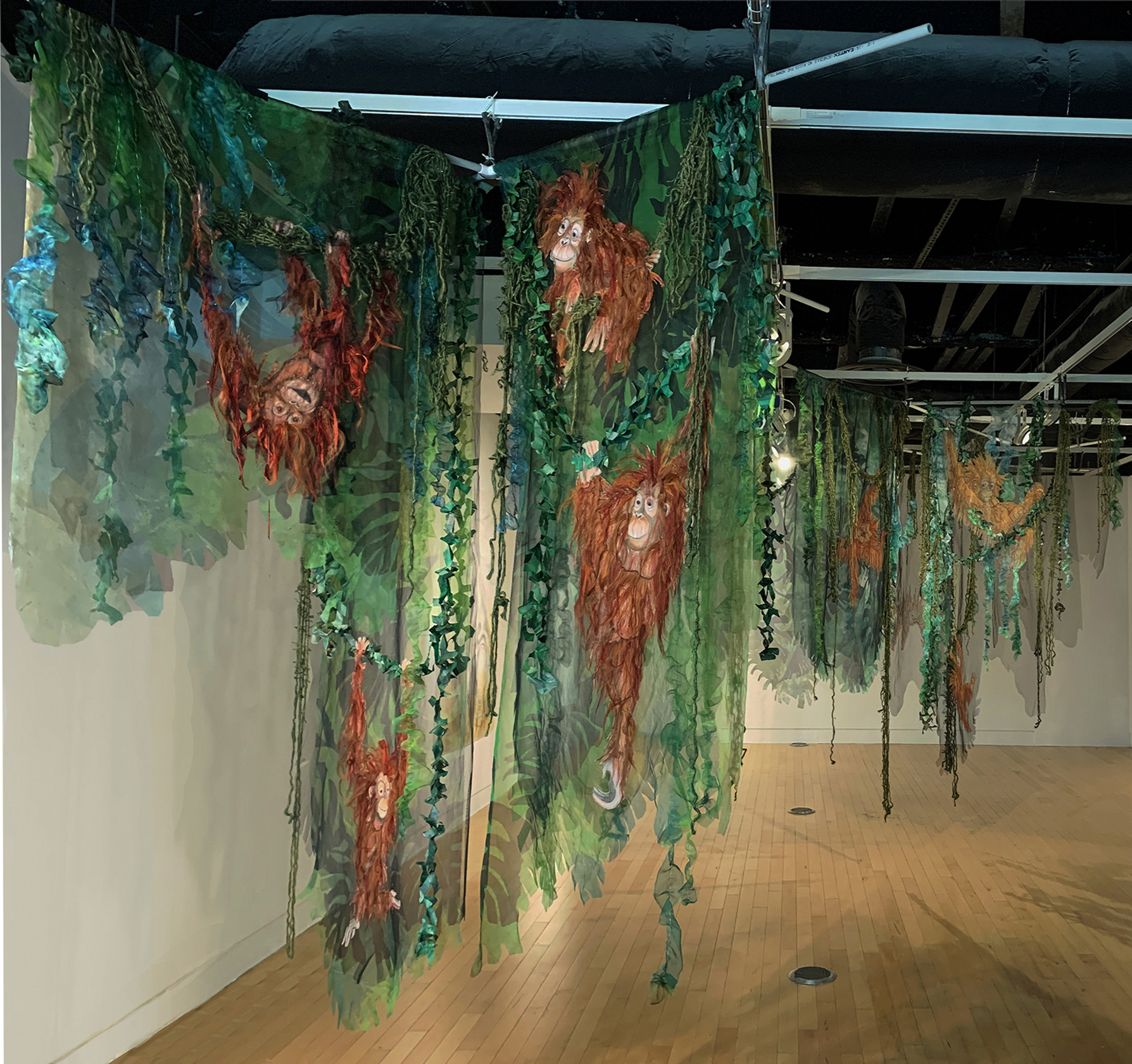 This is a tribute to critically endangered orangutans whose jungle homes are being demolished by palm oil plantations. This installation focuses on 3 phases of their disappearance: Phase 1 we see dimensional babies playing in a lush jungle; Phase 2 we see the jungle and the animals beginning to fade and the jungle starting to disappear; Phase 3 we see a ghostly remnant of the jungle and the animals. I used delicate, sheer layers to express the animals fragility.