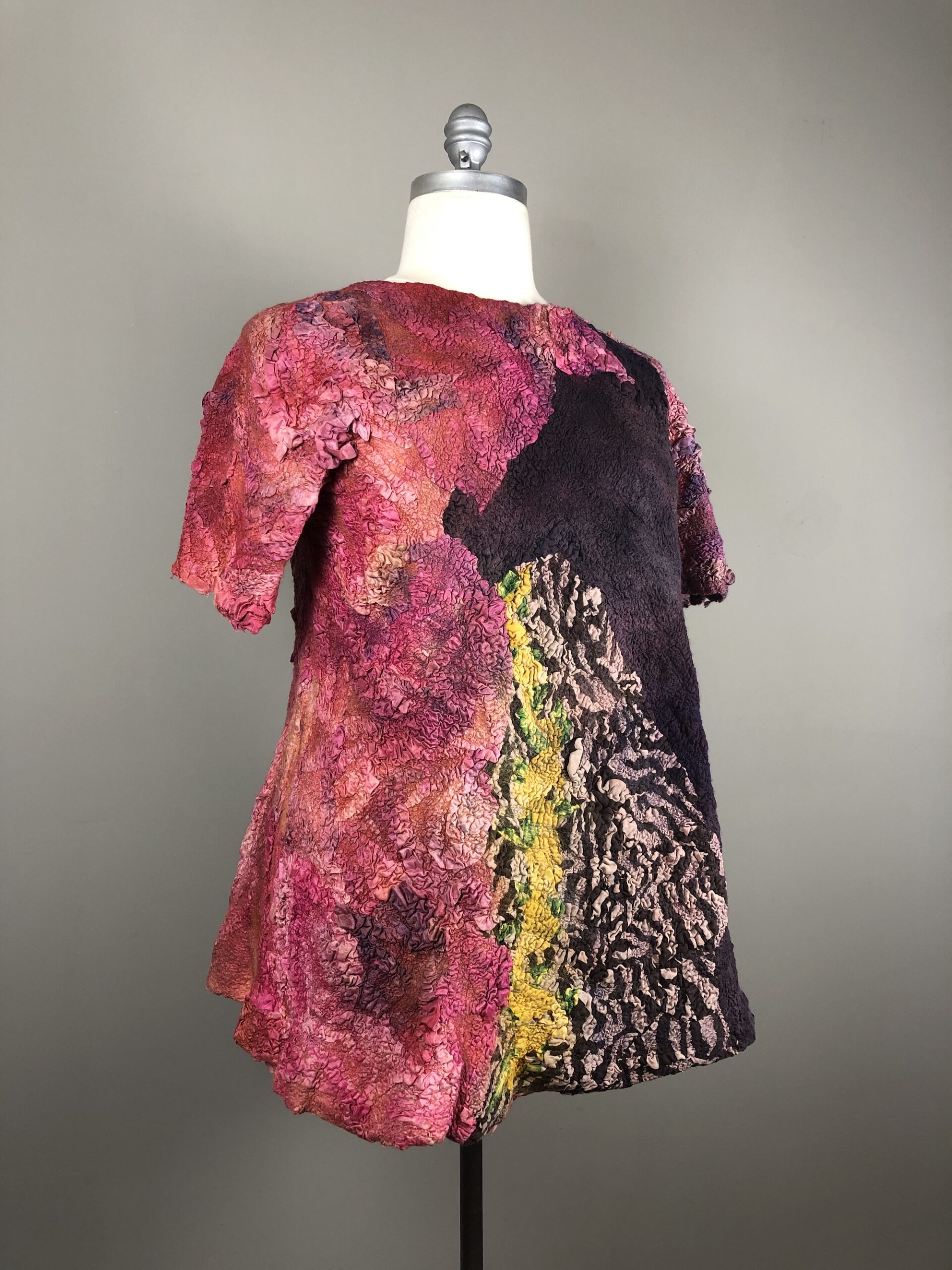 Hand dyed wool and silk felt, beads, sequins. 2 1/2" x 3"