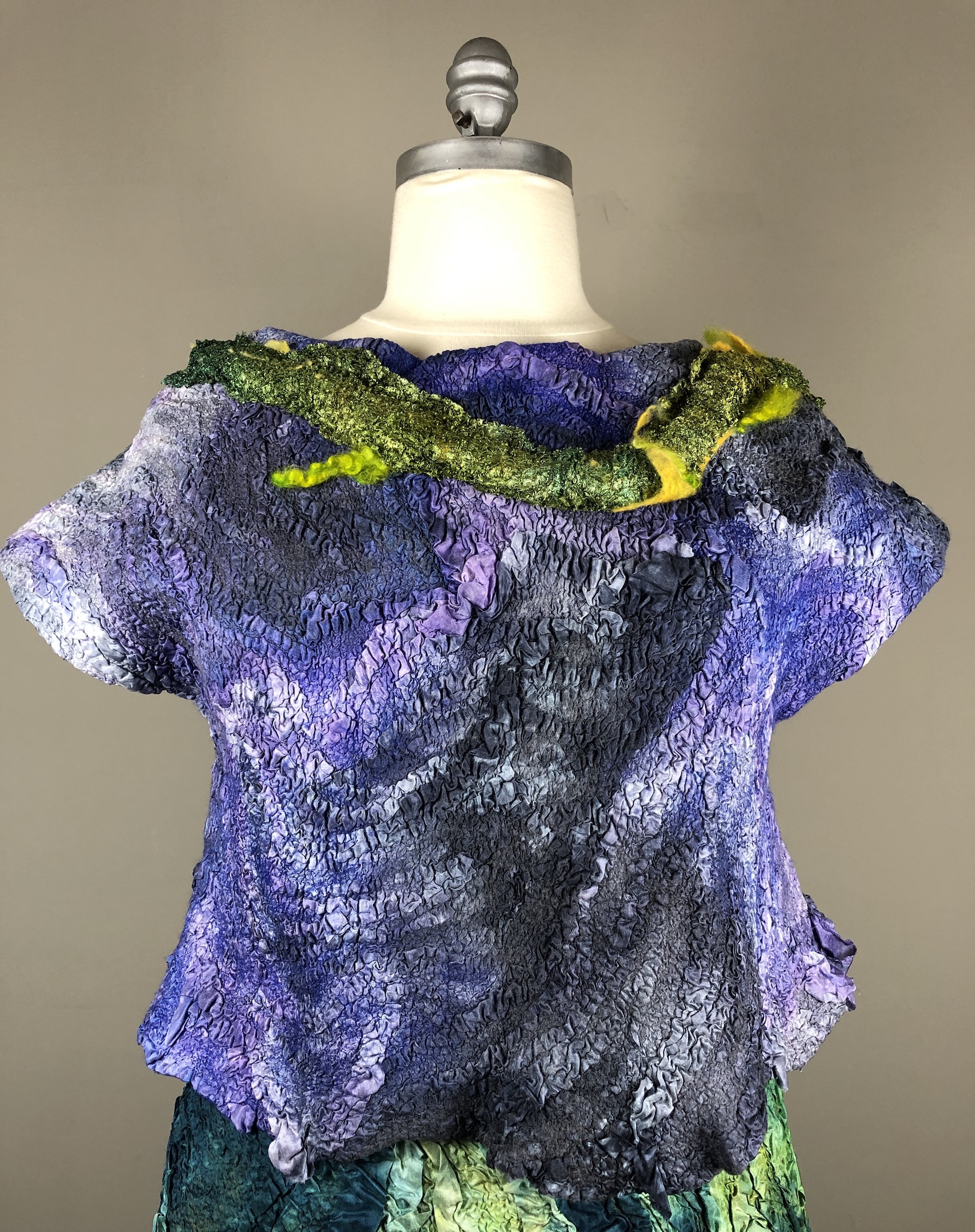 Hand dyed merino wool and silk Nuno felt. 90" X 27"