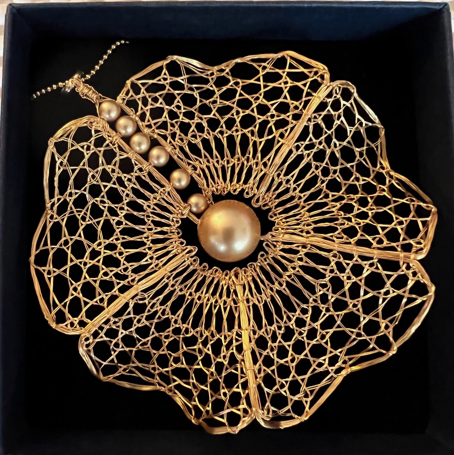 Ceramic calligrahpy with copper wire bobbin lace 10cm diameter x 6cm height