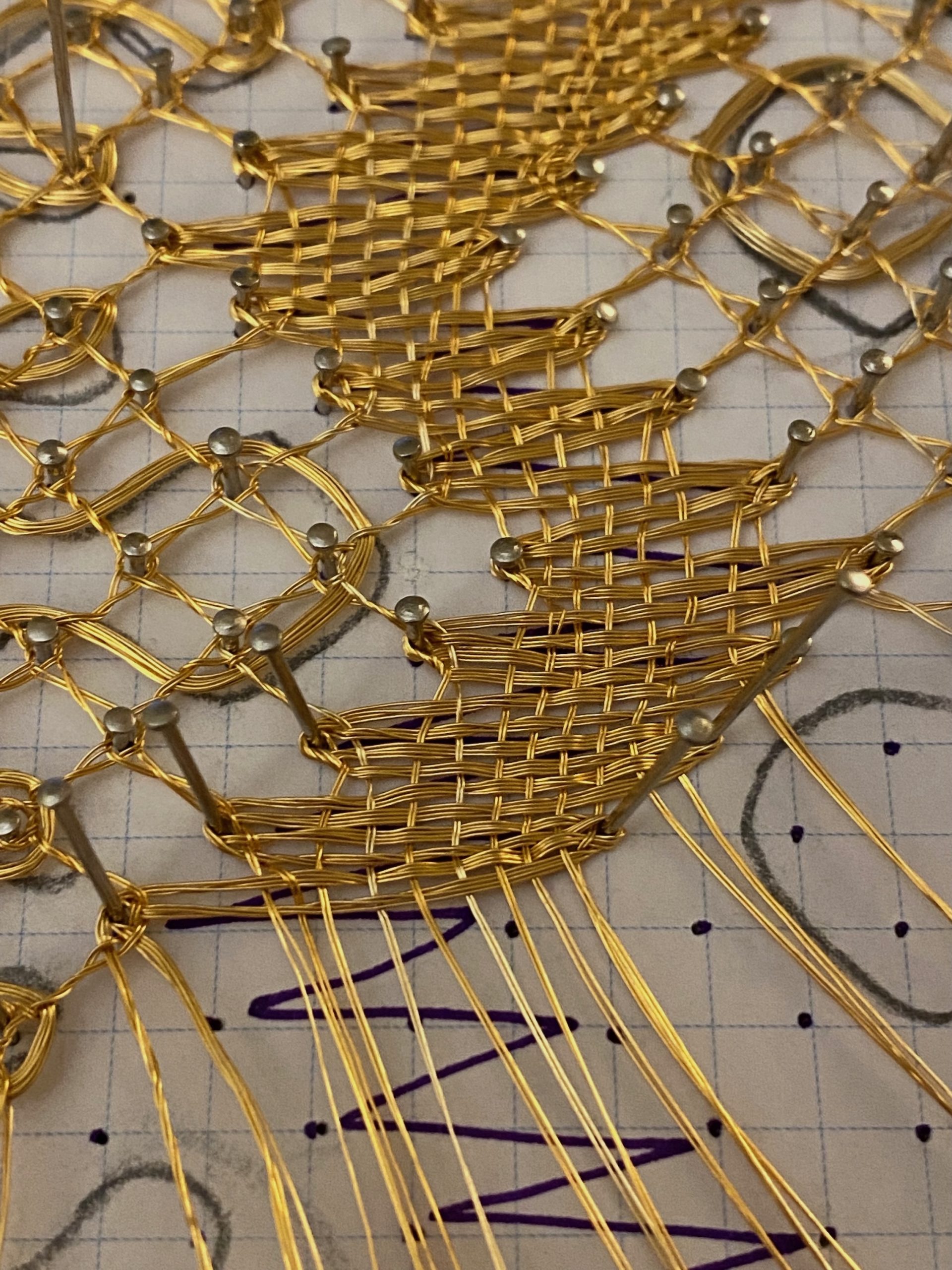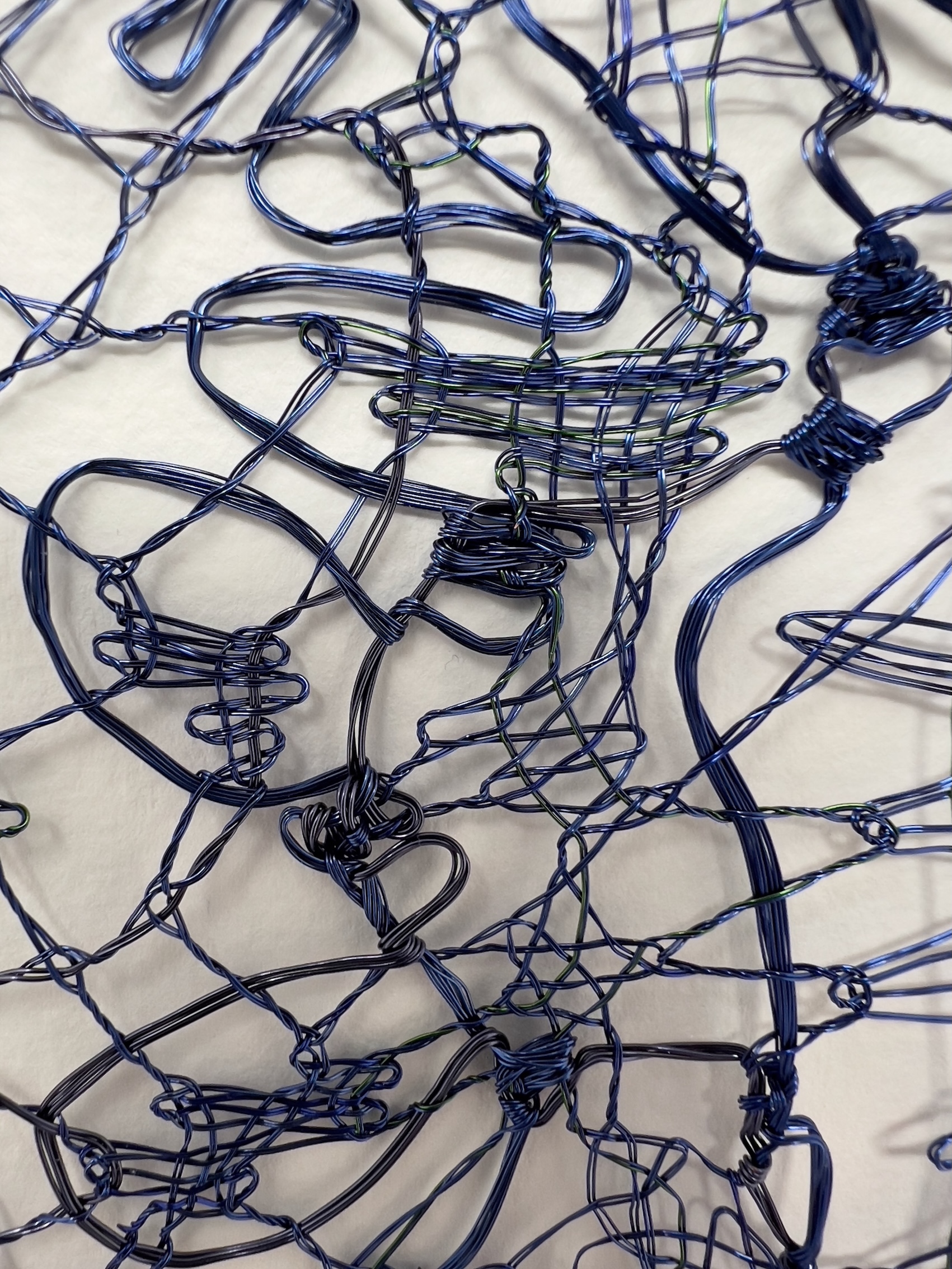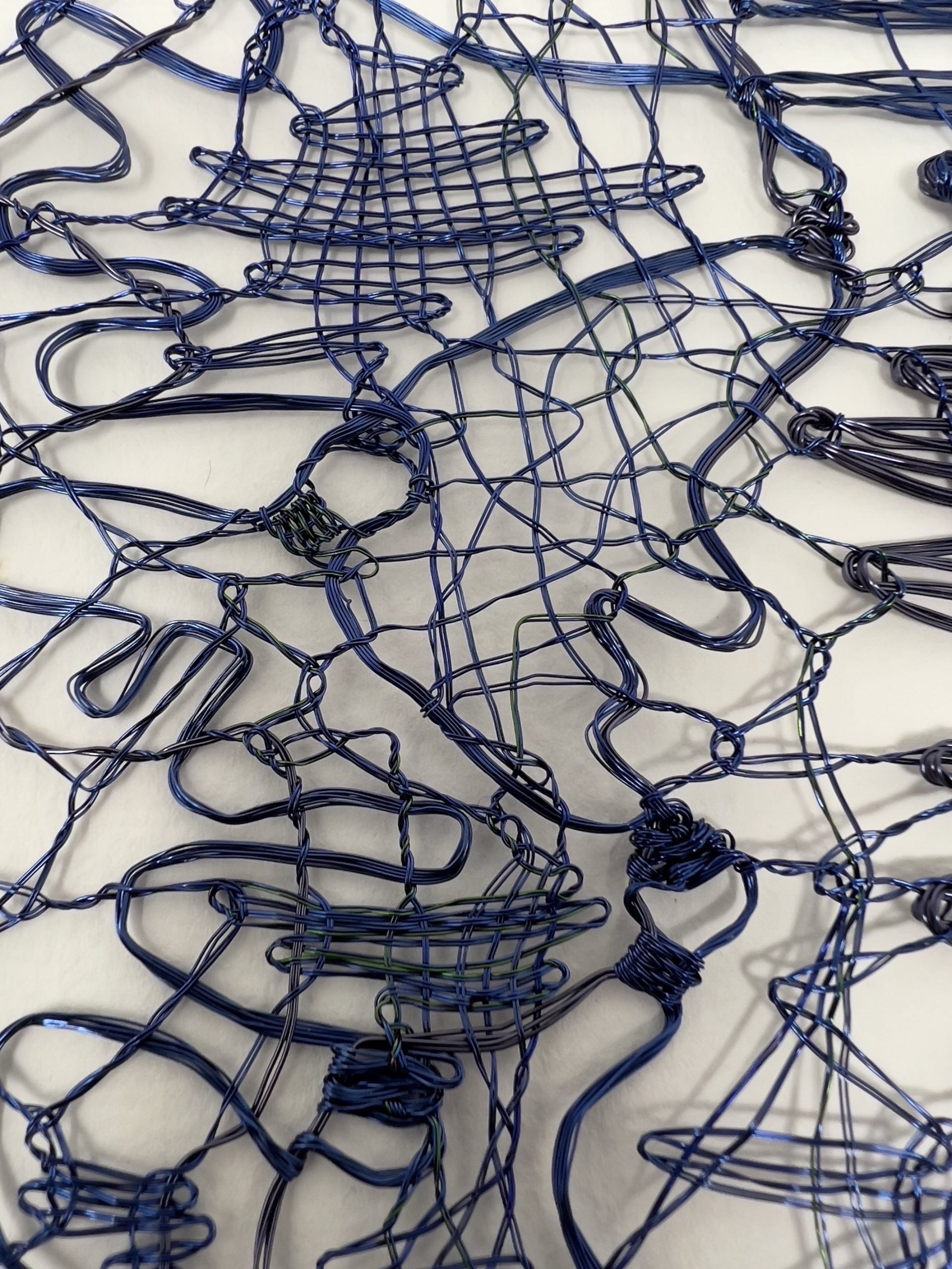 World’s Collide – wire bobbin lace kintsugi on ceramic calligraphy, 2025