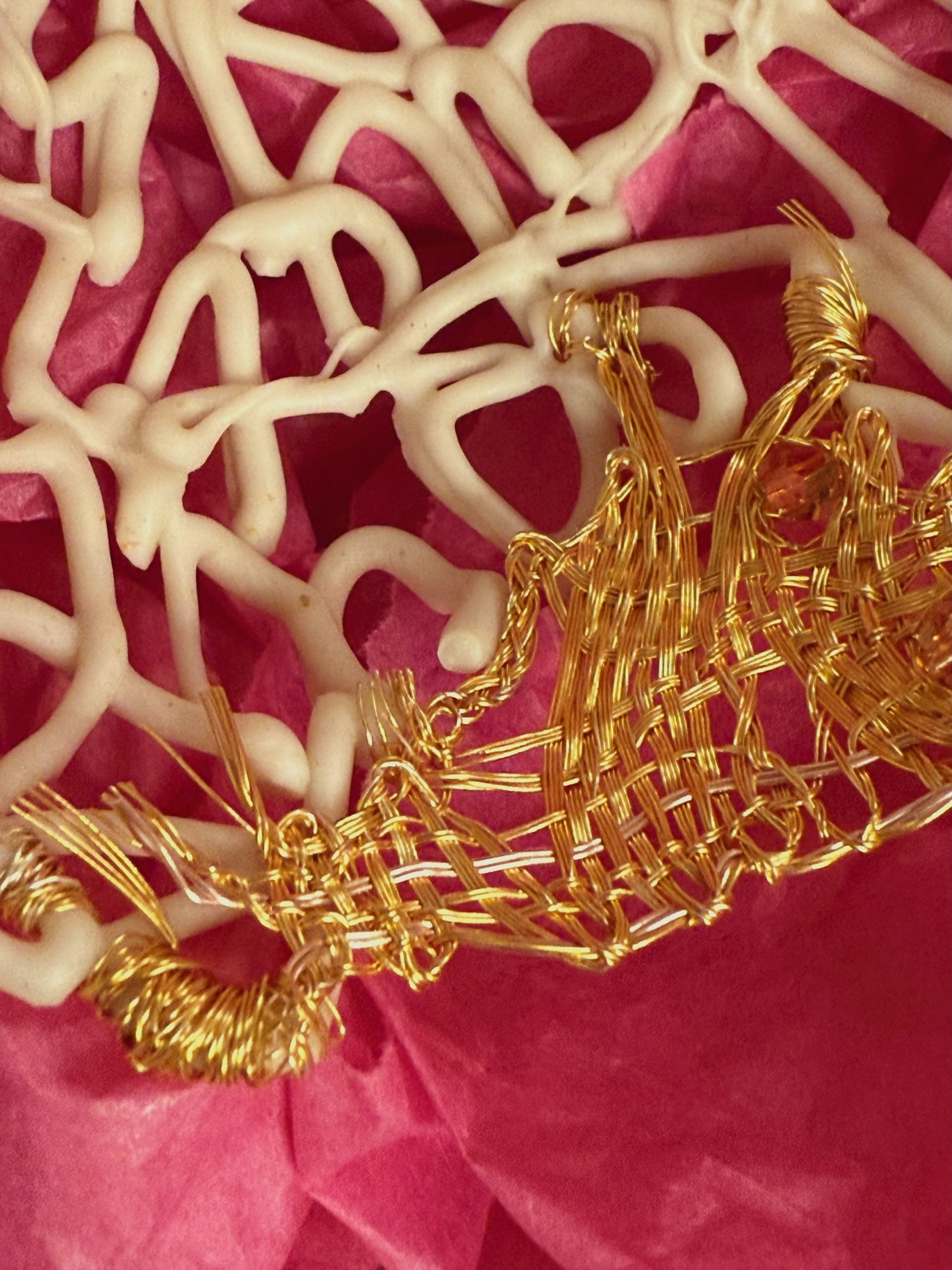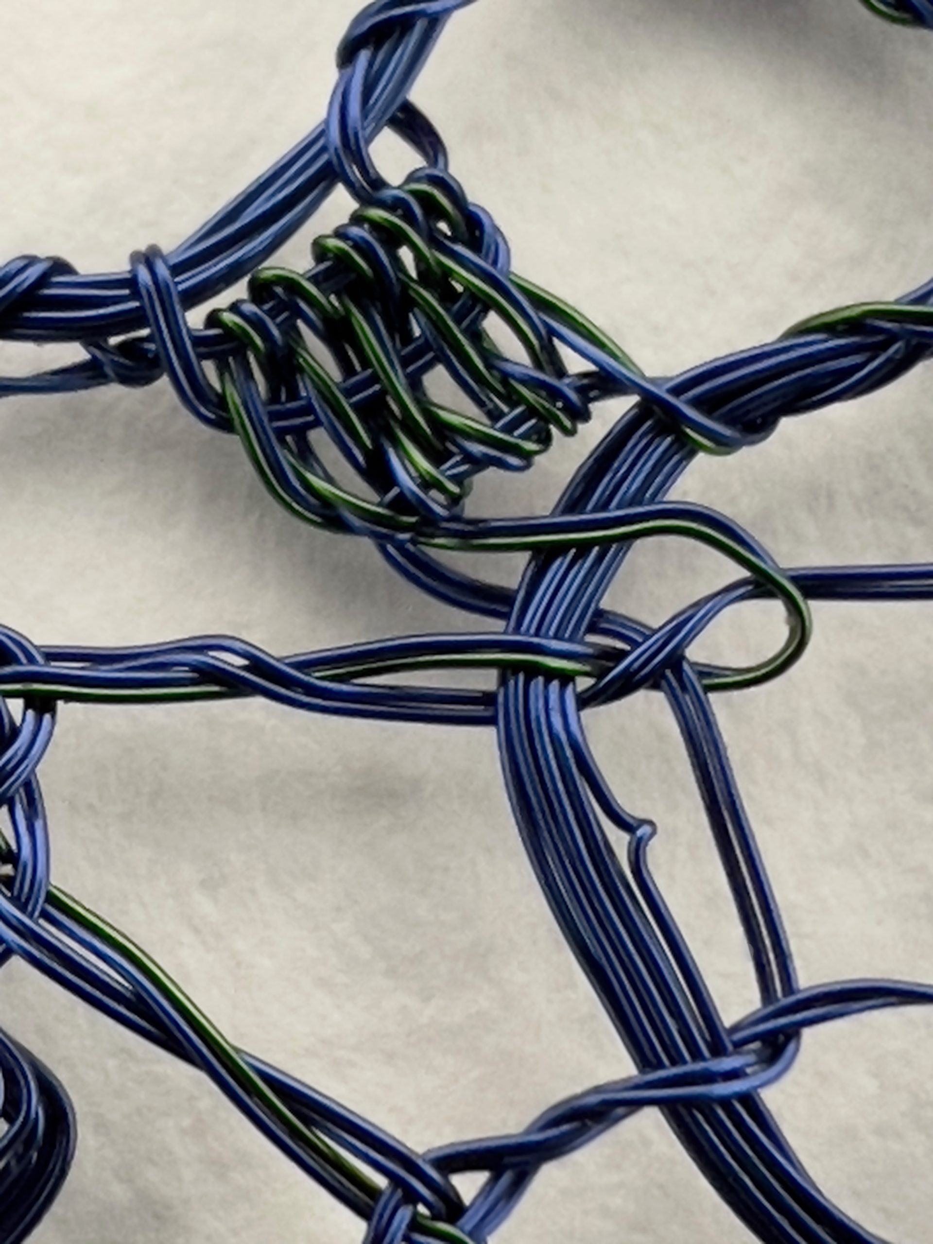 World's Collide - collaboration with ceramic artist Teresa Munn, copper wire bobbin lace kintsugi on ceramic calligraphy coracle