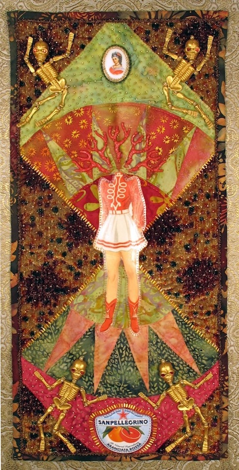 Monotyped silk organza, double layered; stitched, embroidered and embellished with paper doll 16 x 12"