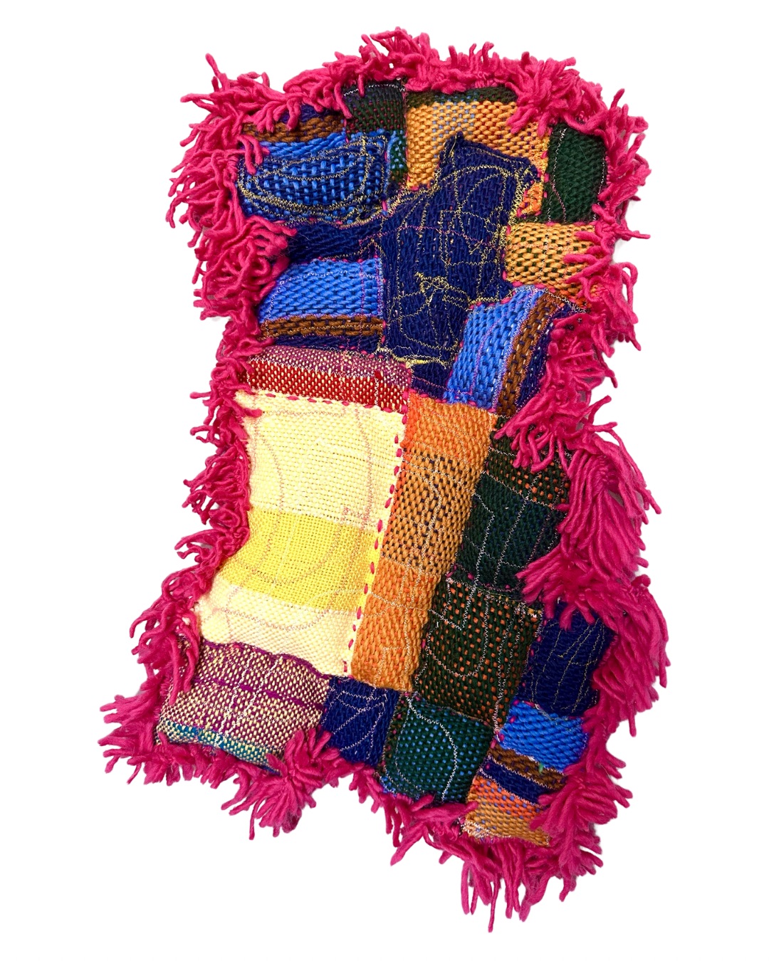 Built from stuffed woven remnants, this piece layers grief and repair. Vivid, contrasting colors create a constant tug and pull, echoing how the quilt—woven after my father died and freely stitched—holds tension between inherited names and chosen identity.