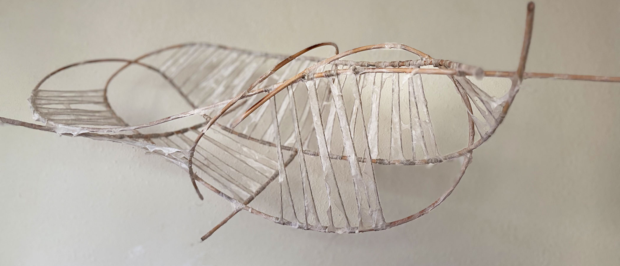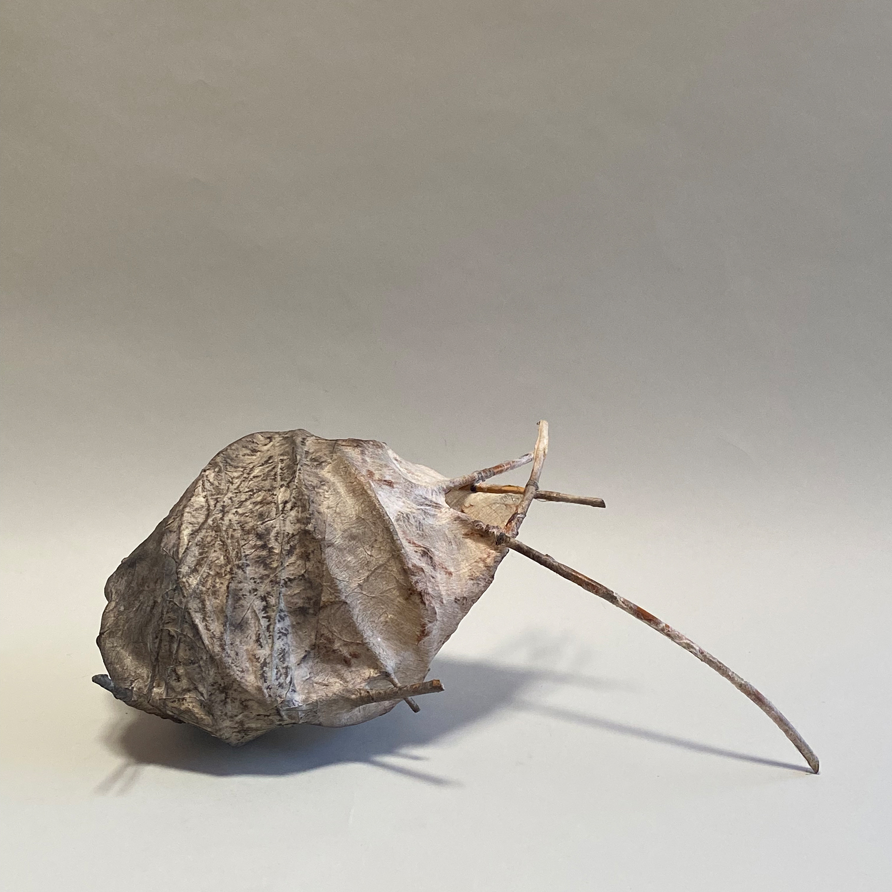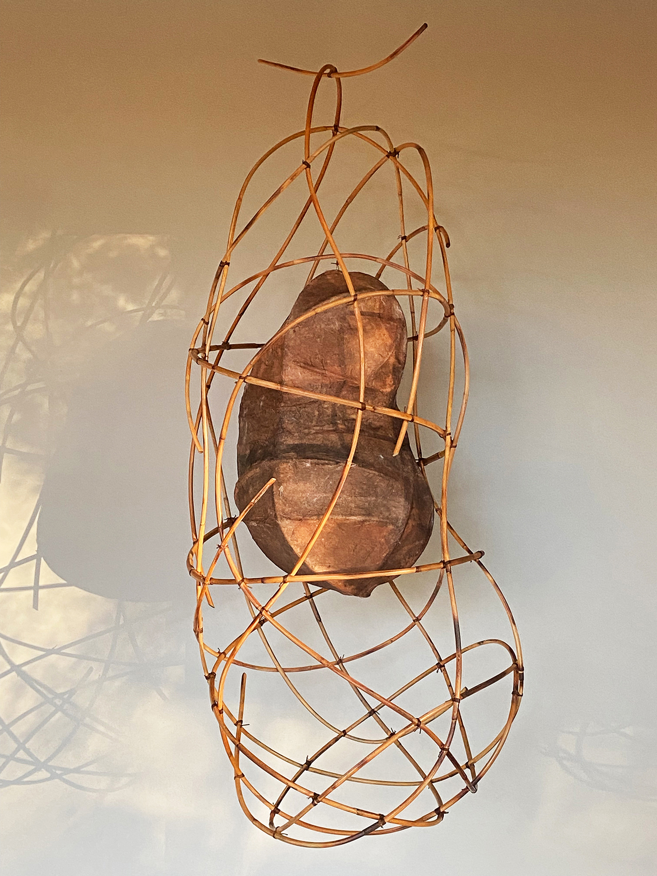 Rattan, handmade kozo paper, kakishibu, thread, ink, waxed linen thread 36 x 15 x 13 inches