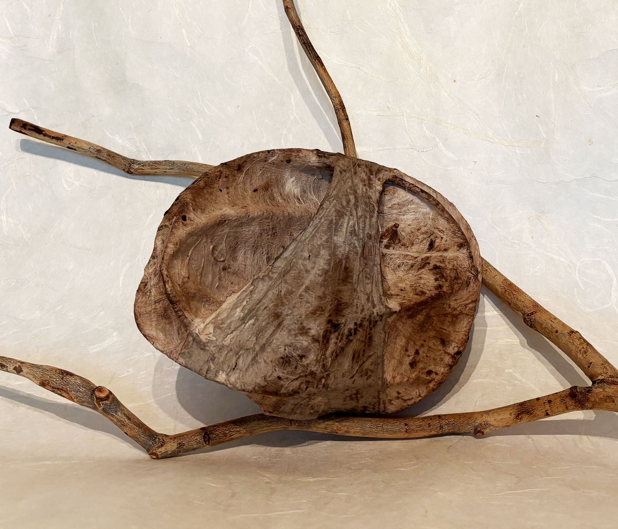 Handmade paper, plant pigment, thread, ink, wood 26 x 21 x 7 inches