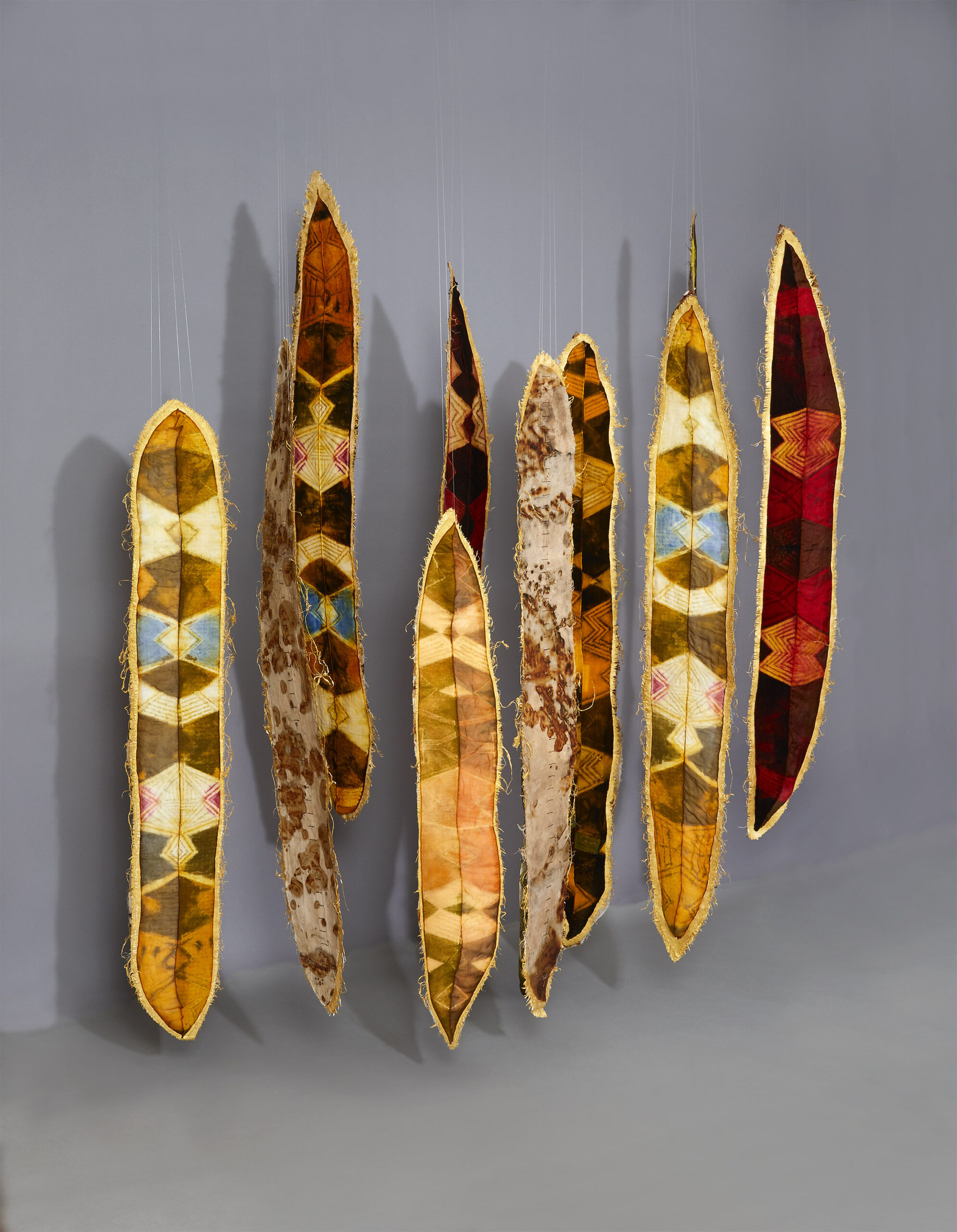 wool, organza, silk noil, acid dyes, rust and tea dyed linen, gesso, strapping, gold paint, linen thread, acrylic tubing, River Birch tree seeds variable; mean length of "pods" is 4 feet long x 8" wide