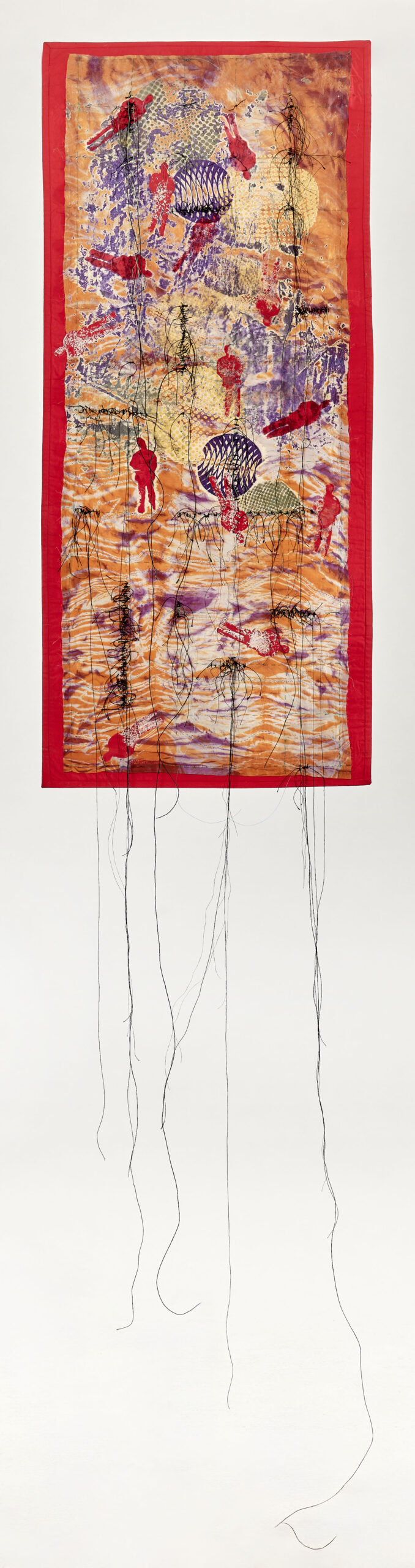 Silk, Muslin, vat and Procion dyes, fabric paint, threads 19" W x 43"H (+ more for hanging threads)