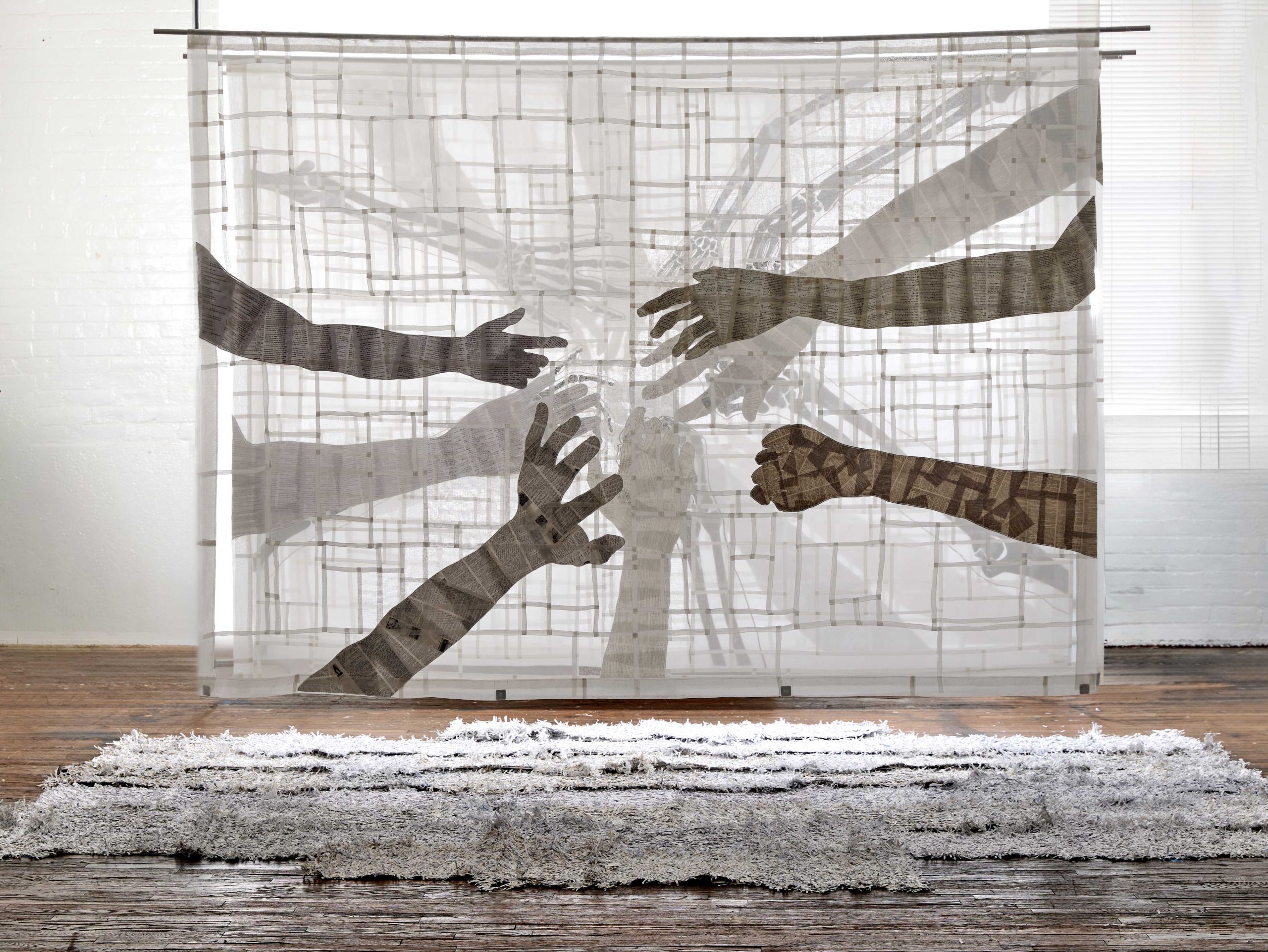 Five Bojagi panels portray a huddle of hands. Each hand contains mono-linguistic dictionary pages. The five most spoken languages of the world are represented. Hnds in the center panel are made of X-ray film. The "floor" is shredded dictionary pages, jumbled, and sewn onto a netting.