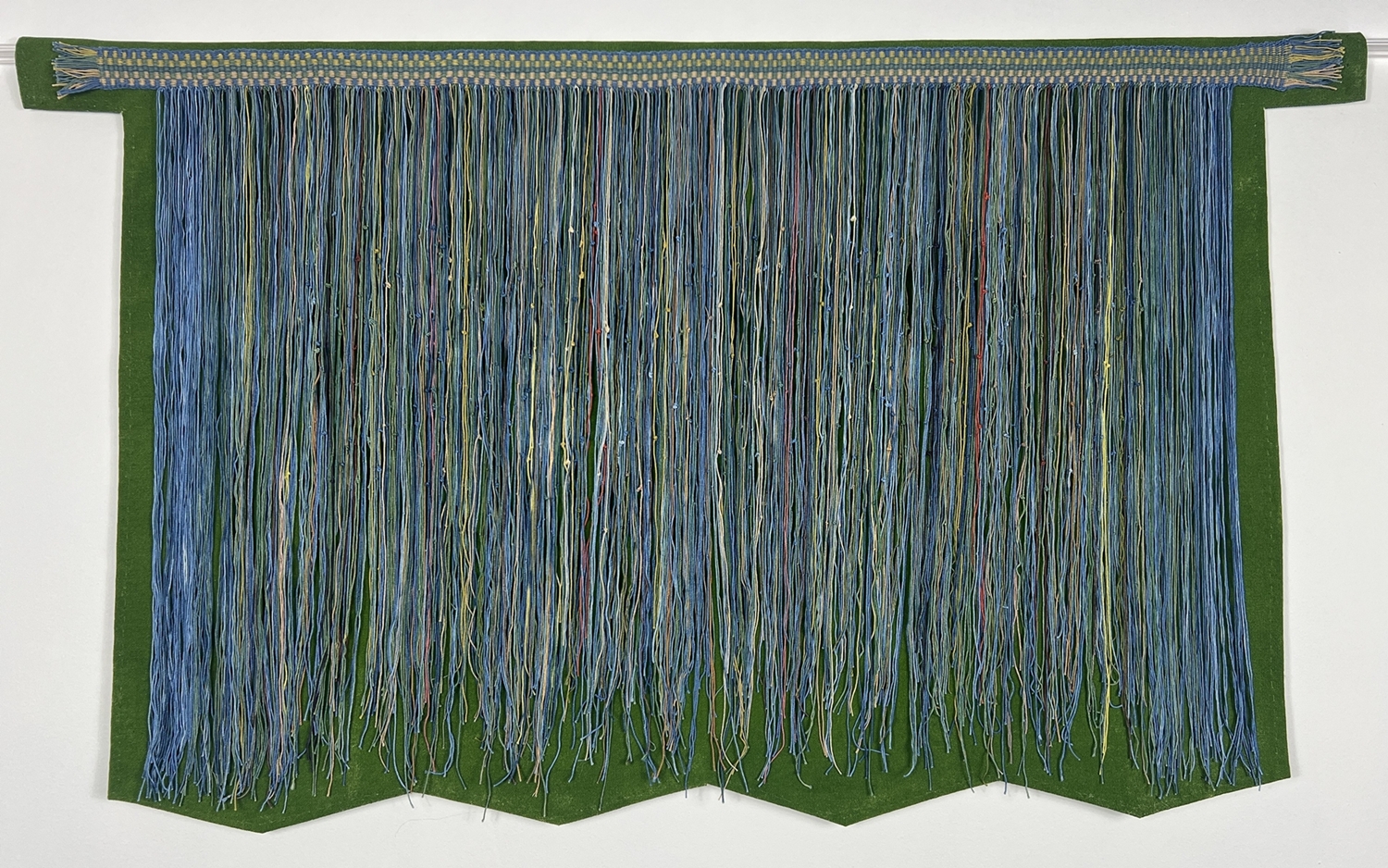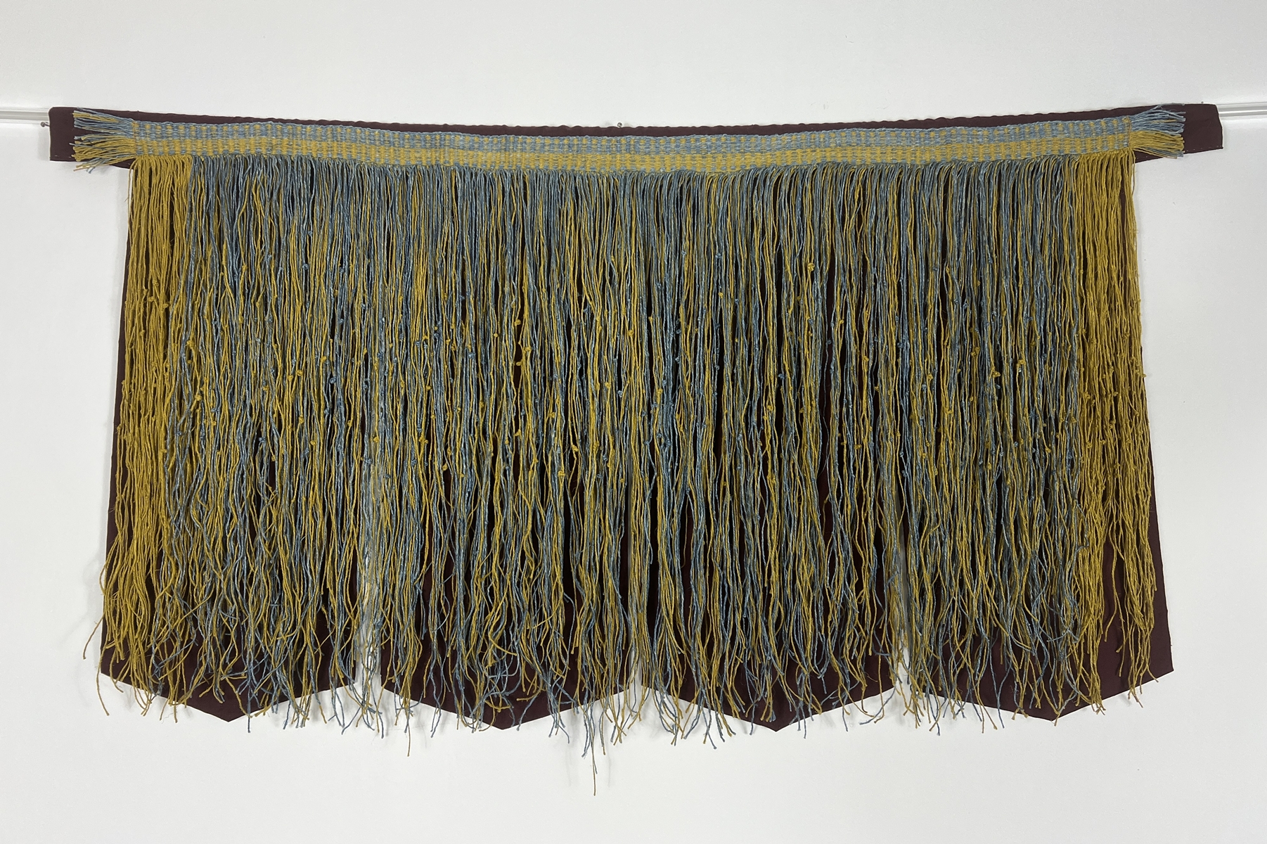 Inspired by paleolithic string skirts and Incan quipus, this war belt contains the entire poem Ave Atque Vale (Hail And Farewell) by Catullus in Morse Code. The original Latin poem is in marigold and the English translation is in indigo. Each string is a letter and the knots represent the dots and dashes - a large knot is a dash and a small knot is a dot.