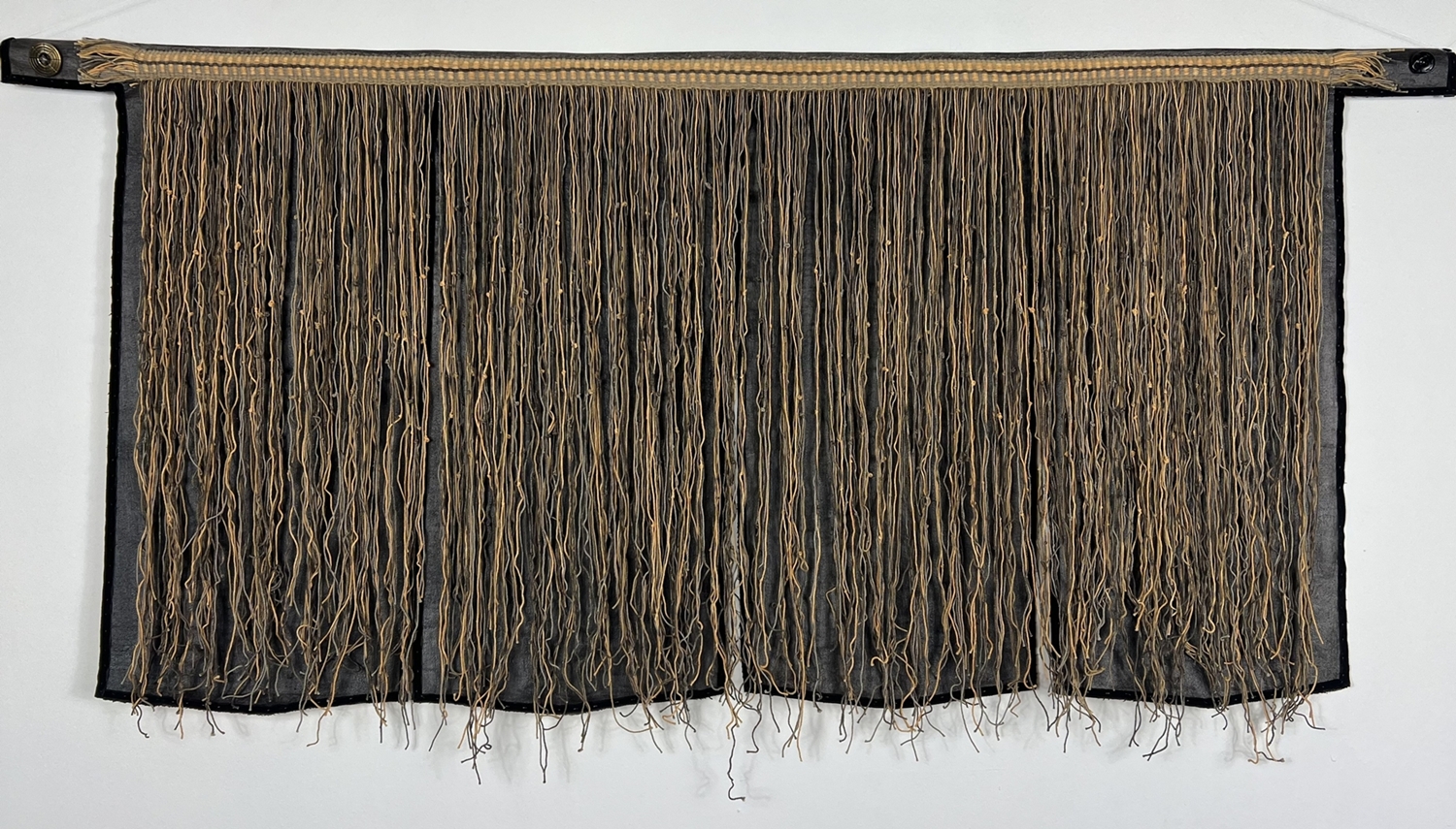 Mercerized cotton hand dyed with iron and tea. Canvas painted with Cassel Earth. Vintage velvet ribbon and button. Hand woven, knotted and sewn. Inspired by paleolithic string skirts and Incan quipus, this war belt contains the entire poem Anthem For Doomed Youth by Wilfred Owen in Morse Code. Each string is a letter and the knots represent the dots and dashes - a large knot is a dash and a small knot is a dot.
