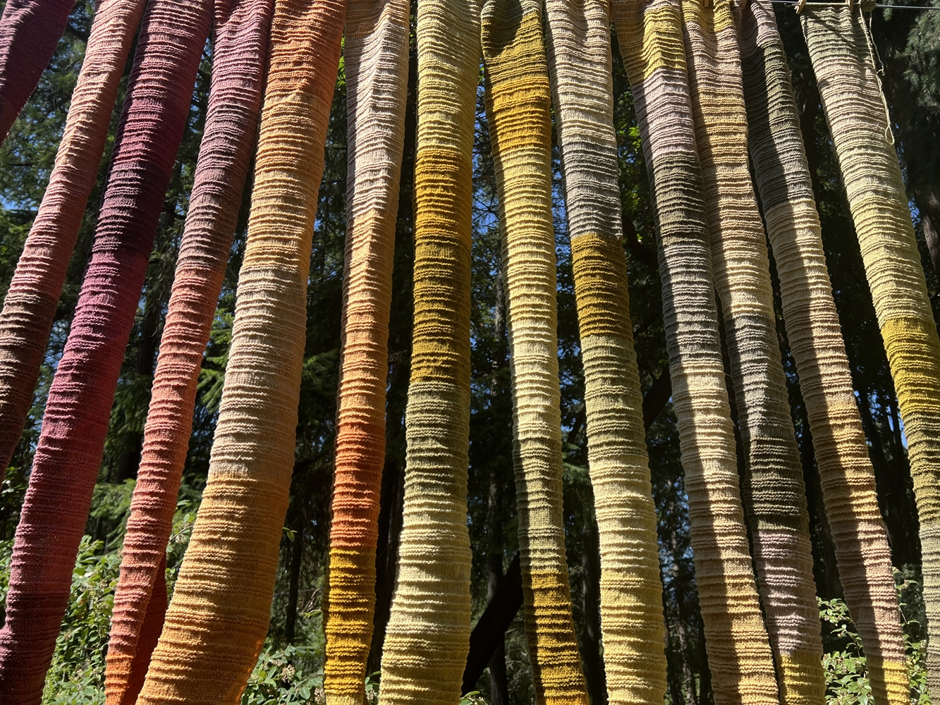 Wool dyed with lobster mushrooms, zinnias, marigolds, st. john's wort, japanese maple leaves 6" x 1044"
