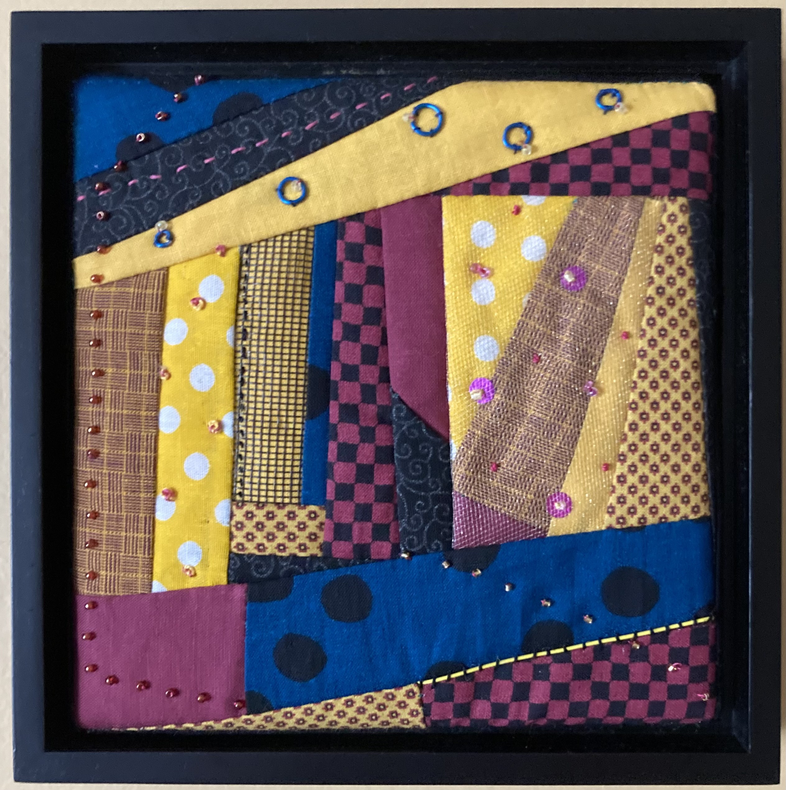 This style of the pieced fabrics is called a "Crazy Quilt" because all of the pieces are random shapes and sizes unlike traditional symmetrical patchwork quilts. After the fabrics are pieced together I begin to embellish the work with new and found fibers, beads, wire, plastics, etc. in a way that enriches the surface of the piece.