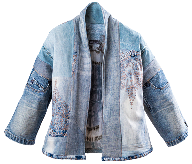 Denim jeans are salvaged from the landfill; deconstructed and collaged into artisanal outerwear